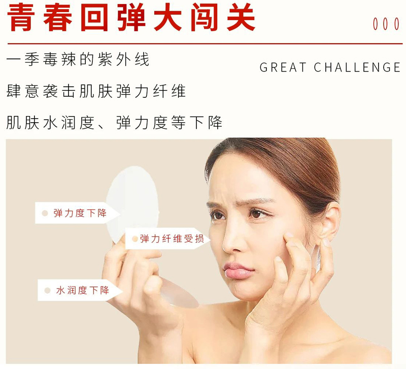 产品功效:赋予肌肤弹性与支撑力,改善肌肤紧实功能,提升肌肤饱满度与弹性度,紧致塑颜,青春弹润。
