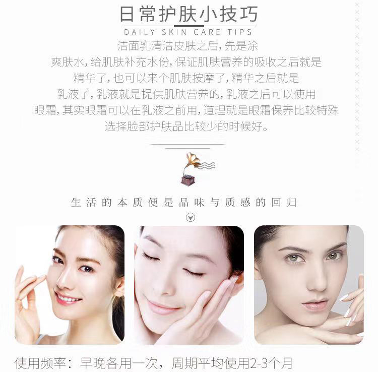 产品功效:有淡化肌肤细纹,改善皱纹和拉伸纹。让肌肤恢复年轻态,富有弹性。