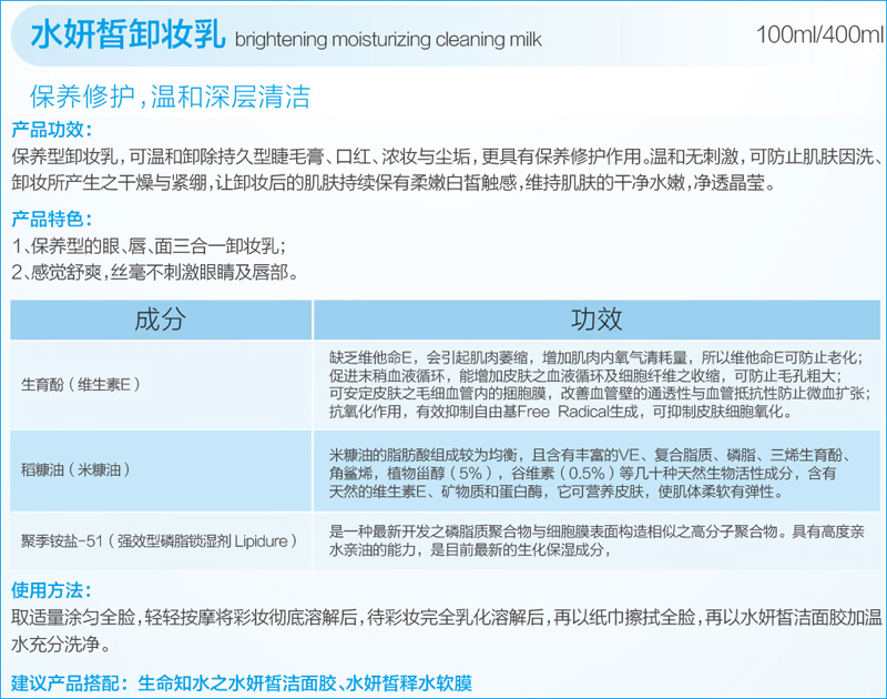 产品功效:保养型卸妆乳,可温和卸除持久型睫毛膏、口红、浓妆与尘垢,更具有保养修护作用。温和无刺激,可防止肌肤因洗、卸妆所产生之干燥与紧绷,让卸妆后的肌肤持续保有柔嫩白皙触感,维持肌肤的干净水嫩,净透晶莹。