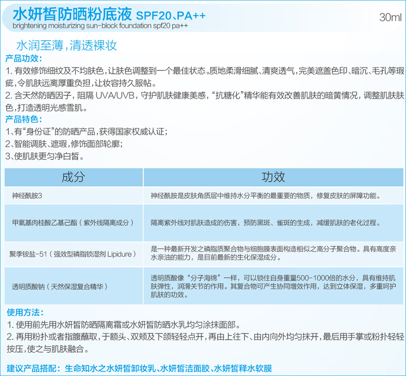 使用方法:用于防晒隔离乳后,取适量均匀涂抹于全脸及颈部肌肤,以指腹或粉扑轻轻涂匀即可。