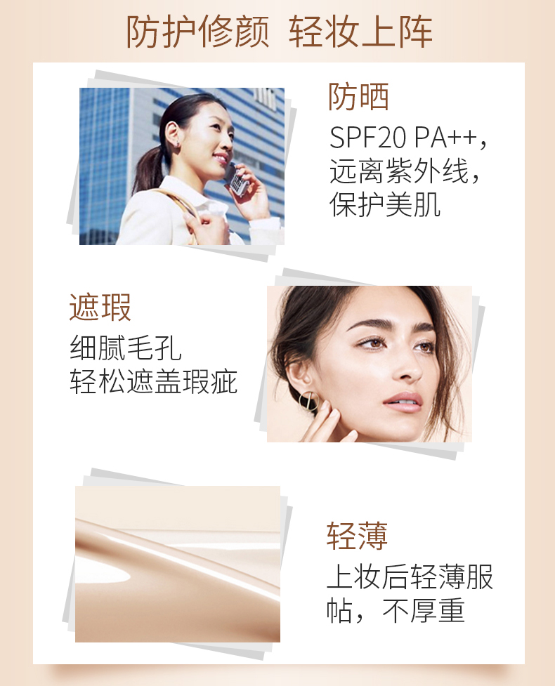 1.有修饰细纹及不均肤色,让肤色调整到一个佳状态。质地柔滑细腻、清爽透气,完美遮盖色印、暗沉、毛孔等瑕疵,令肌肤远离厚重负担,让妆容持久服帖。