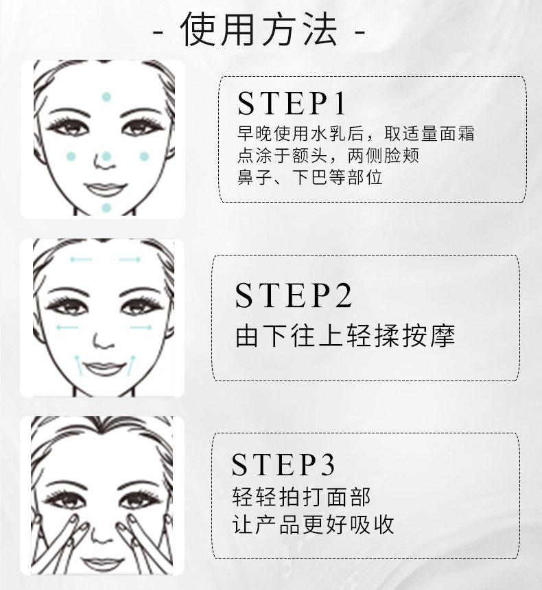 使用方法:取适量涂抹全脸及颈部,轻轻按摩至完全吸收。本品建议可做晚霜使用。
