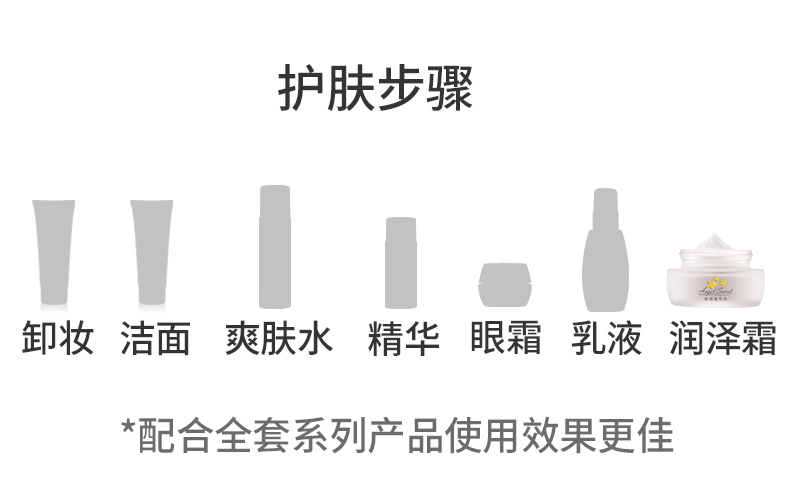 产品功效:丰润的保养霜,能在肌肤表面形成薄膜,防止水份流失,让肌肤恢复光泽弹力、改善细纹,保持紧缩上提性,提升角质层滋润度,让肌肤纹理重现规则紧致的排列,发挥全天候保湿及焕亮肌肤功,用后肌肤更加白皙匀嫩,有减少黑色素形成,对深度缺水的细纹肌肤,季节转换的脱屑状况,同样果,让肌肤不缺水,维持容光焕发好风采,本品亦可做晚霜使用。
