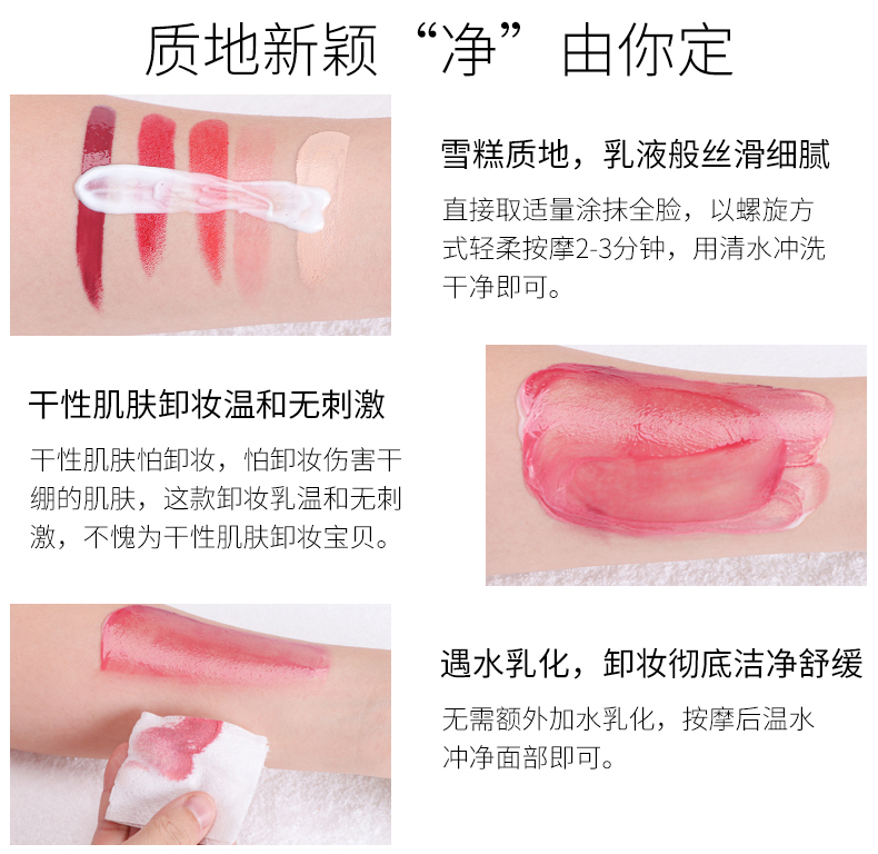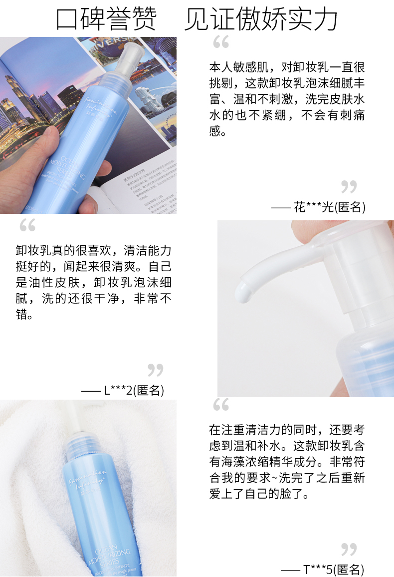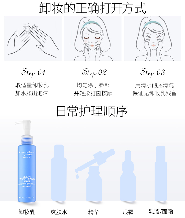 优异保湿果的柔和卸妆乳,温和无刺激,能溶解彩妆及多余油脂,轻盈完整地包覆您的脸,轻松卸除脸部污垢,蕴含深海多种天然保湿成分,可软化肌肤老死,恢复肌肤的弹力与张力,令卸妆后的肌肤水润舒爽,无紧绷干涩的感觉。