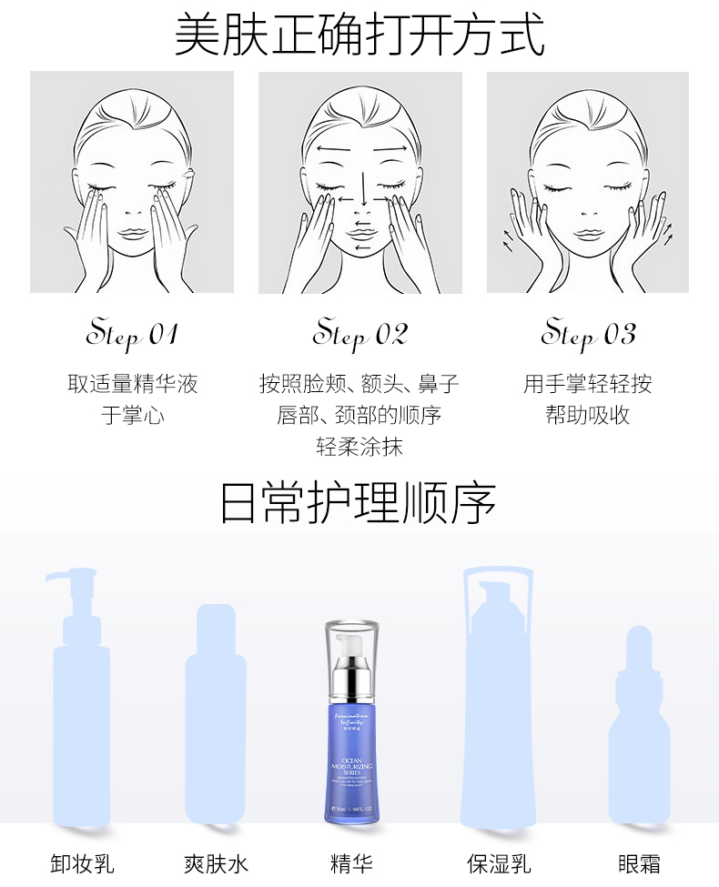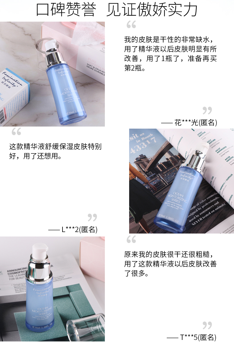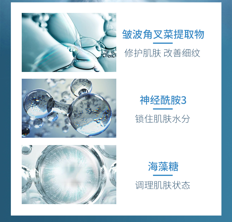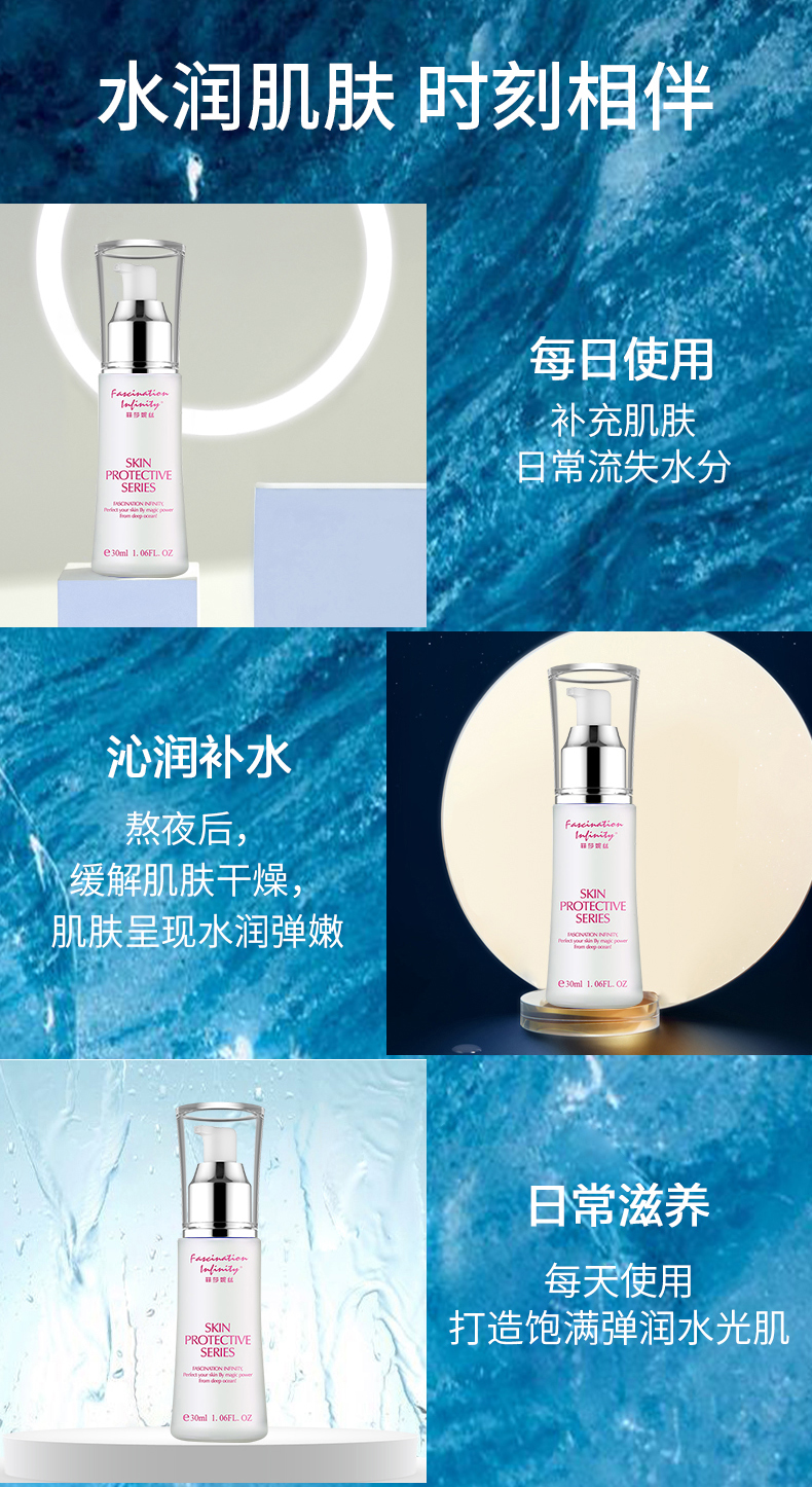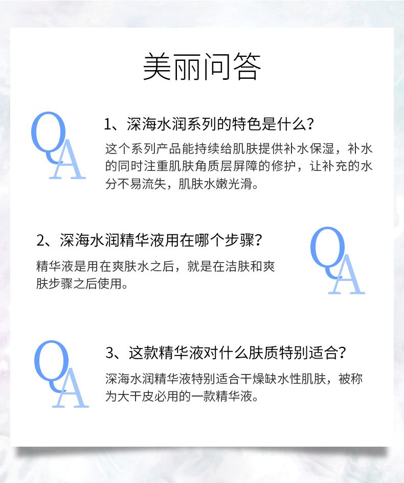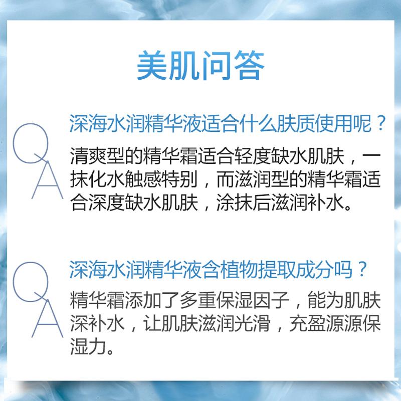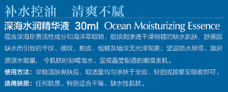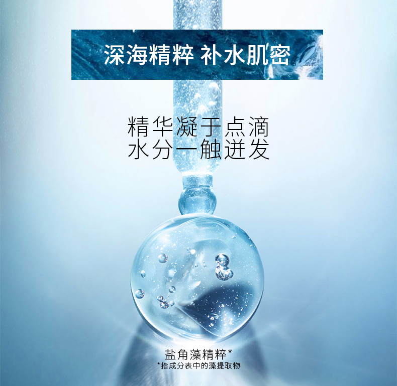 产品特点:清新沁润质地,触肤即溶并渗透至肌肤深层,为肌肤补充大量水分并发挥持续保湿功能。蕴含深海珍贵活性成分和海洋萃取物,能顷刻渗透干燥粗糙的缺水肌肤,舒展因缺水而引致的干纹、细纹、脱皮、粗糙及暗淡无光泽现象;坚固锁水屏障,激启源源水能量, 令肌肤时刻喝饱水,呈现晶莹剔透的嫩滑美肌。