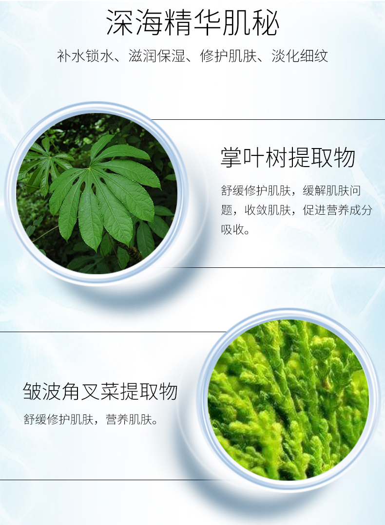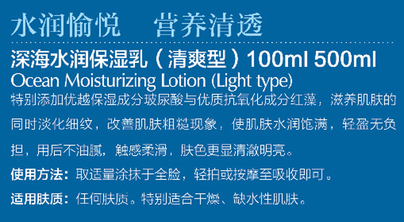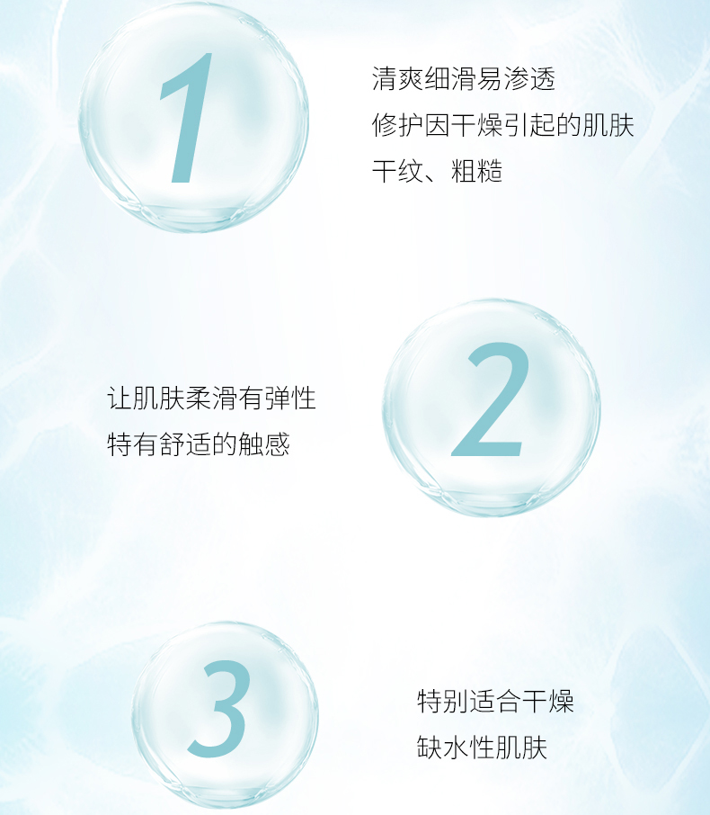 产品特点:特别添加优越保湿成分玻尿酸与优质抗氧化成分巨藻,滋养肌肤的同时淡化细纹,改善肌肤粗糙现象,使肌肤水润饱满,触感柔滑,肤色更显清澈明亮。