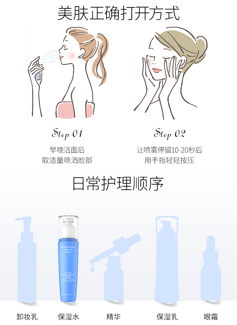 产品用途:补水、保湿、调理、一款产品、三重到位,蕴含生化糖醛酸保湿精华,可即时渗入肌肤强力补水,使每一寸肌肤喝饱水的同时在皮肤表面形成水润保护膜。深海多种矿物精华,可以软化肌肤角质,改善因换季产生的肌肤脱皮、干燥、粗糙等问题,舒缓保湿、令肌肤时刻呈现水润剔透。