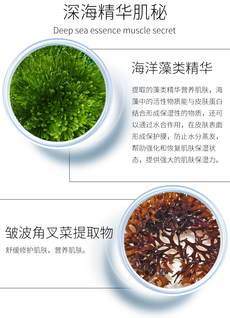 产品成分:纯水、甘油、丁二醇、透明质酸、黄原胶、海藻糖、海草硫酸化寡糖、绿藻提取物、盐生杜氏藻提取物、赫氏圆石藻提取物、苯氧乙醇烷基脲、EDTA二钠、精油。