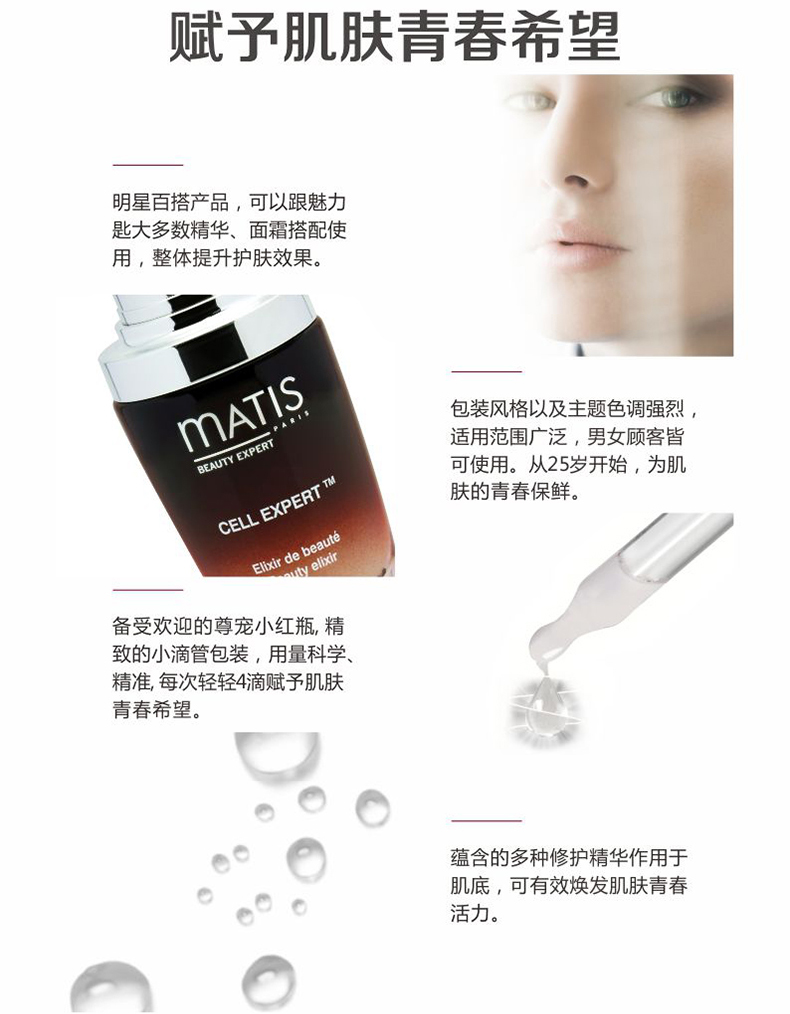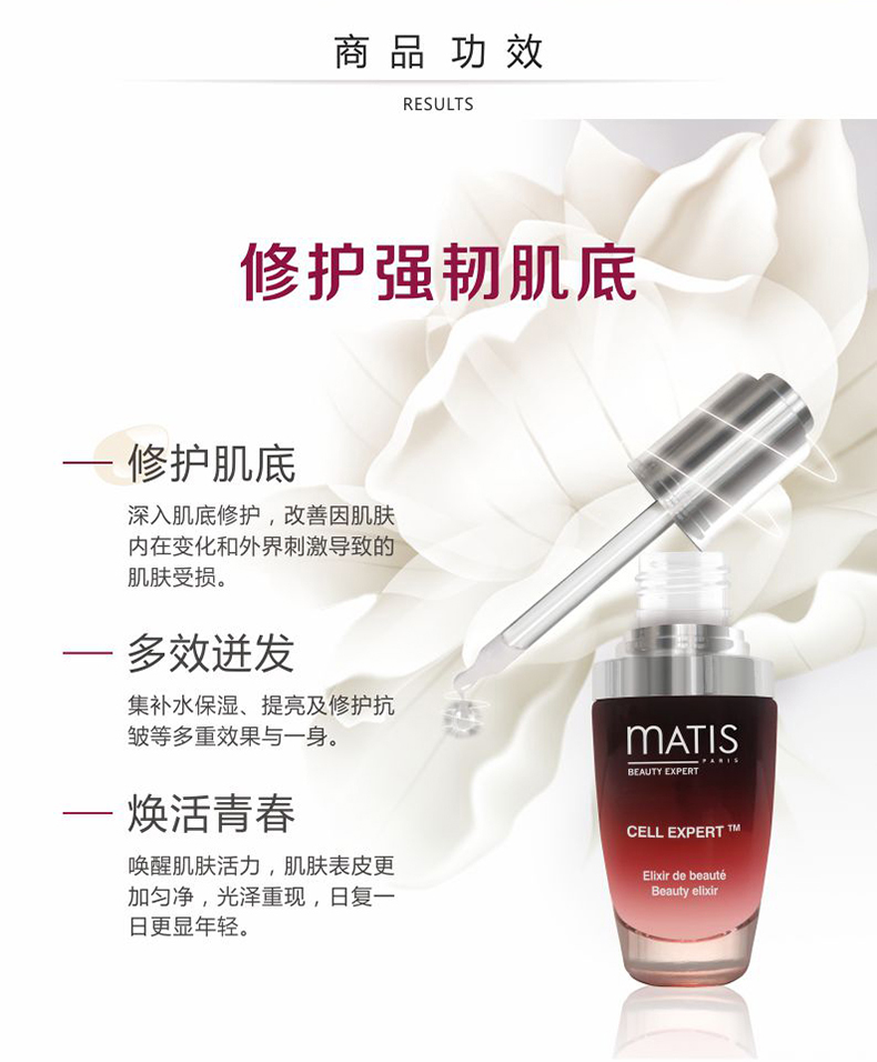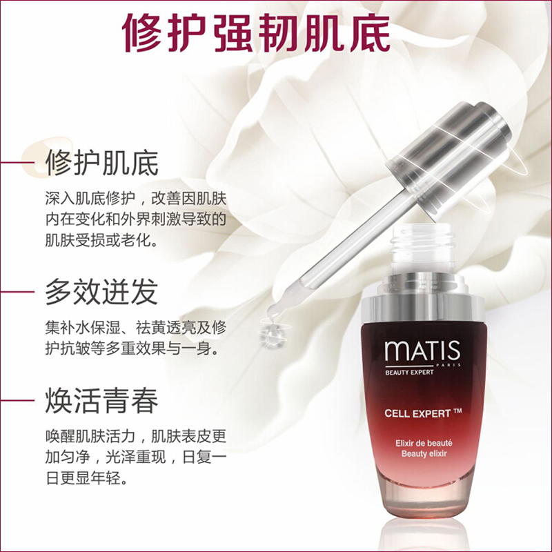mATIS法国实验室70多位生物专家的倾力之作,从整株天然野生白玫瑰中提取[植物·干],研创出高科技******成分matiStem CCTM,从肌肤源头逆溯肌龄,创造新生,及时促进致密排列,为肌肤带来青春永驻的神奇转变。一滴,焕发肌肤新生希望!