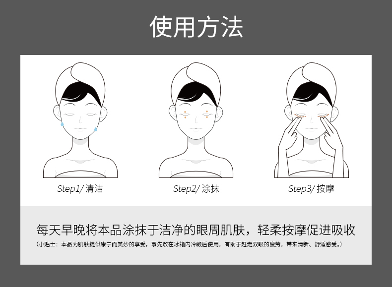 mATIS美容贴士:早晚洁肤后,使用无名指取适量眼霜,沿着内眼角至外眼角方向,涂抹于上下眼脸及其周围。平抚并轻轻拍按,直至眼霜被彻底吸收。