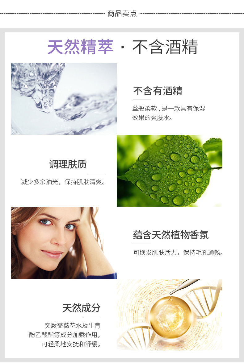 产品说明:不含酒精成份,在洁面爽肤的同时亦能为肌肤补湿。锁住水份,维持肌肤水油平衡,减退油光。全新的配方令肌肤柔软,时刻保持幼嫩细滑,时刻保持幼嫩润滑。