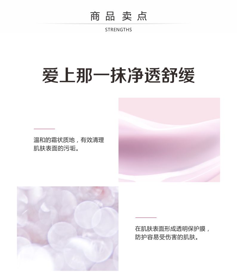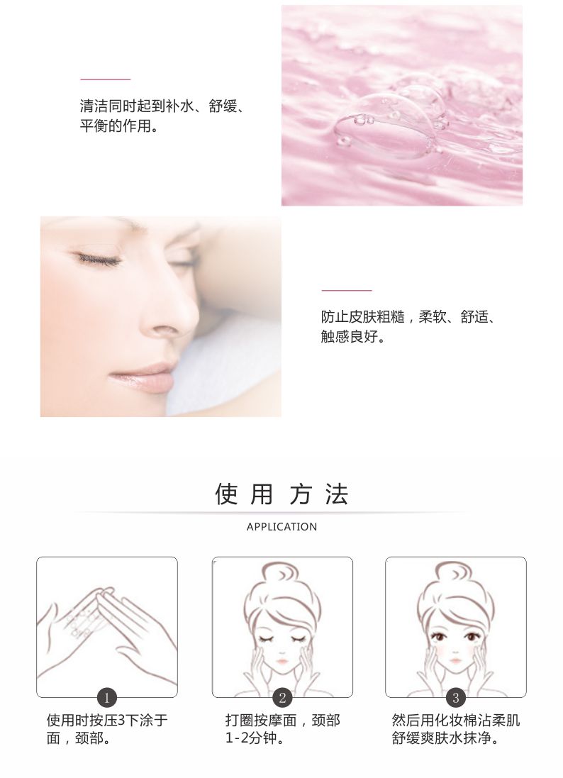 2.温和地改善肌肤表面的污垢及妆容。含丰富的柔肌因子,无损肌肤表面的水脂膜(hydro-lipidicfilm),在清洁的同时具有补湿、舒缓及柔肌的作用。用后肌肤如丝柔软、感觉舒适。