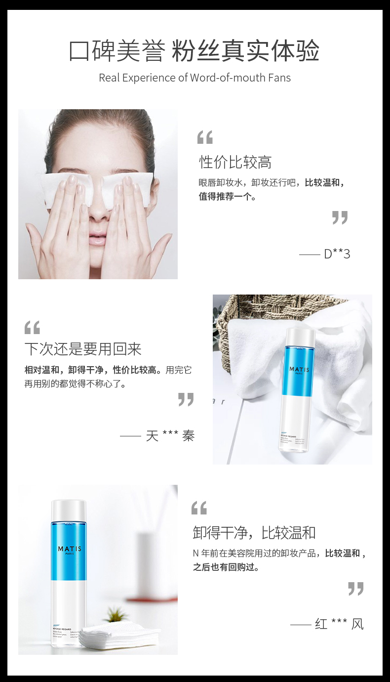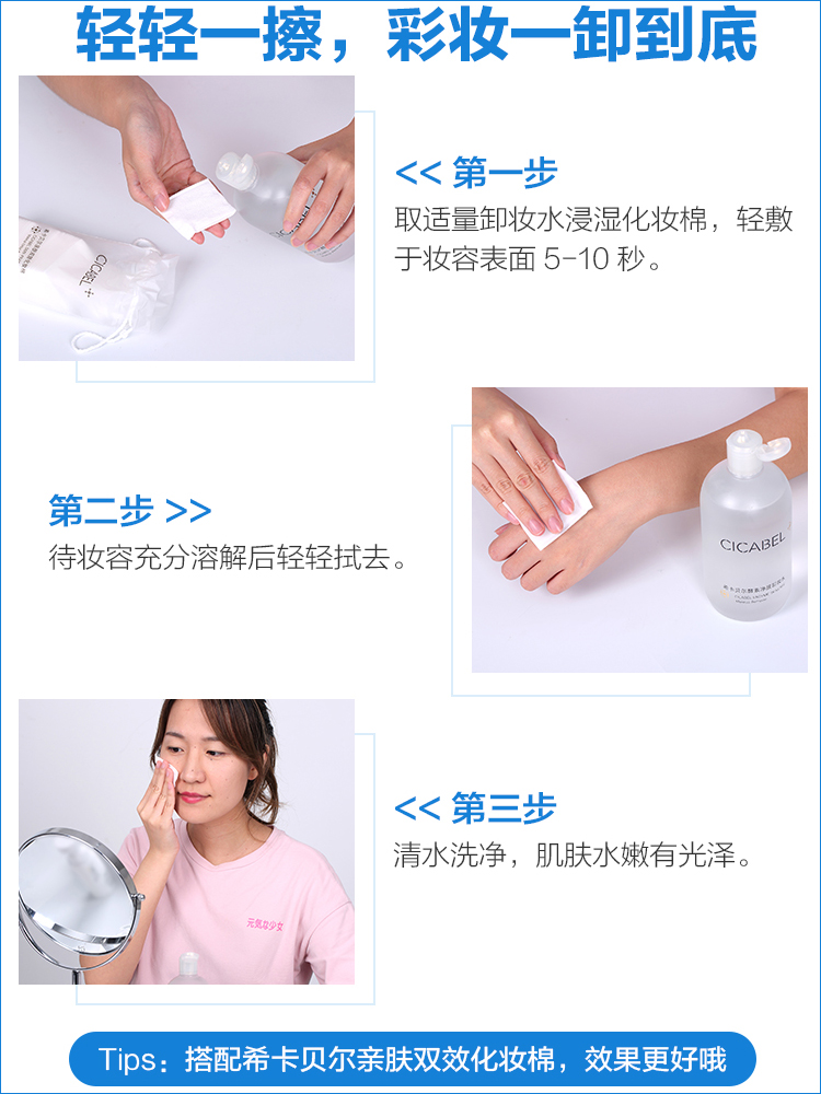 2.为使清洁果更佳,使用前请先摇匀,令两种液体充分混合。由于眼部的彩妆较难卸掉而且眼周肌肤较为敏弱,选用卸妆产品特别是适宜在脆弱的眼周肌肤上使用的卸妆产品是很重要的,彻底卸妆能确保后续使用的护肤产品能更好地发挥功。