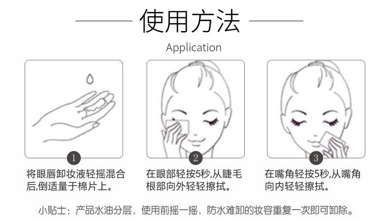 1.用前摇匀,以化妆棉取适量本品敷于眼、唇部并轻轻擦拭,对特别顽固的彩妆可适当延长敷润时间。