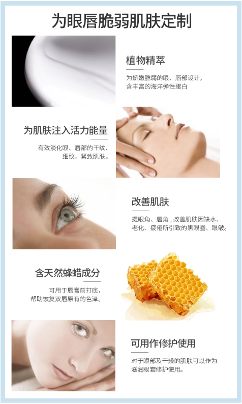 2.含海洋弹性蛋白和植物精华,为肌肤注入丰富的滋养和全新的活力能量,减退眼、唇部的干纹、细纹,紧实肌肤,提升眼角、唇角。明显改善因缺水、老化、疲倦所引致的黑眼圈及眼皱。还可用于唇膏前打底,帮助双唇恢复原有的色泽,饱满而丰盈。