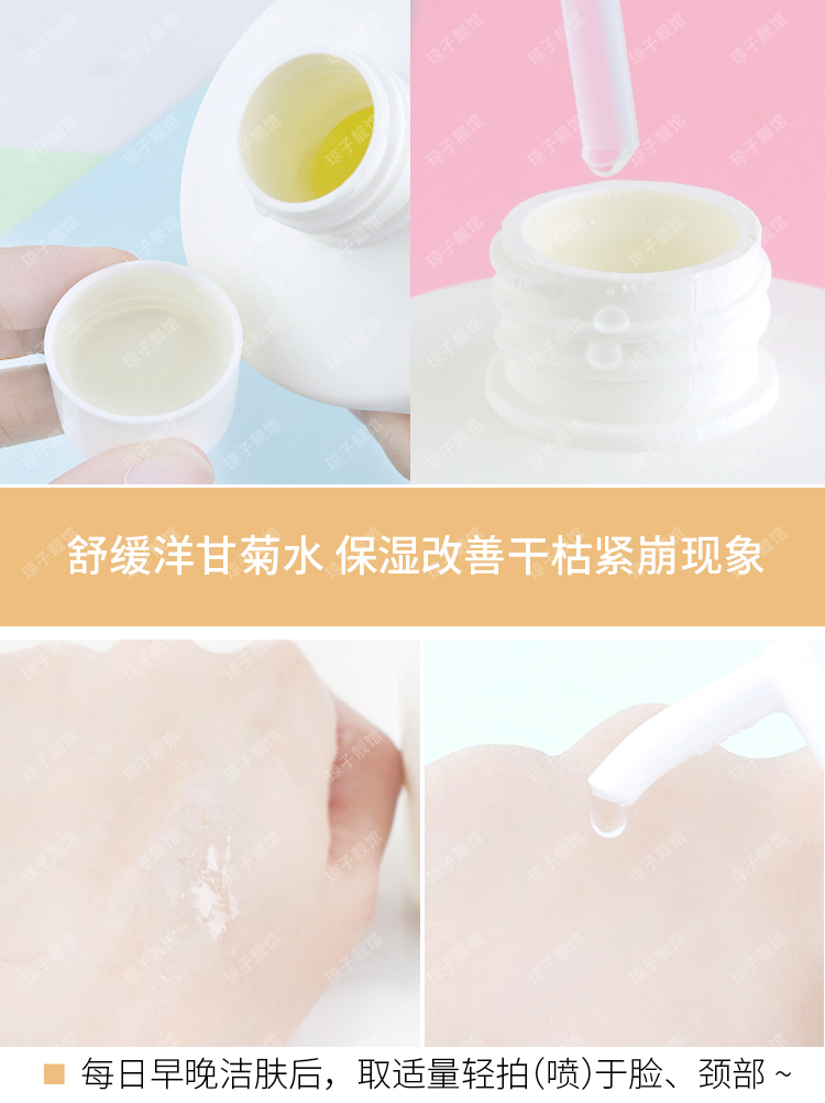 产品用法:每日早晚洁肤后,取适量轻拍(喷)于脸、颈部。