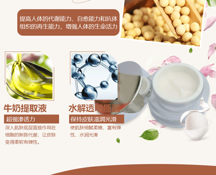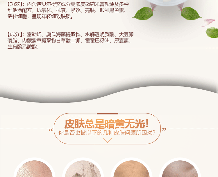 产品作用:有效改善老化、粗黑、暗黄、色斑现象,具有抗氧化、抗老化、抗色斑、抗粗黑、抑制自由基,改善黑色素生成,维持焕活青春容颜,是亮白减斑有效的一款霜品。