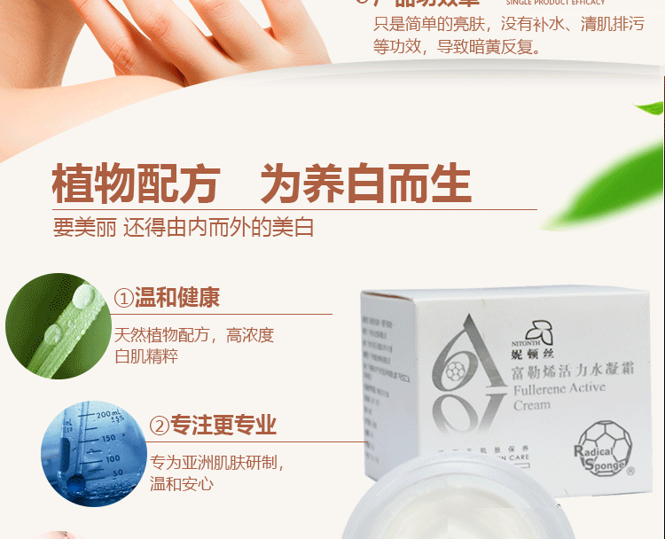 产品特色:此品添加抗氧化的富勒烯1.2%的高含量,交强去除自由基、抗氧化、抗老化、抗粗黑,能减少黑色素信号的传递,去除黑色素、亮白减斑、平衡油脂、亦能减少粉刺痘痘生长。