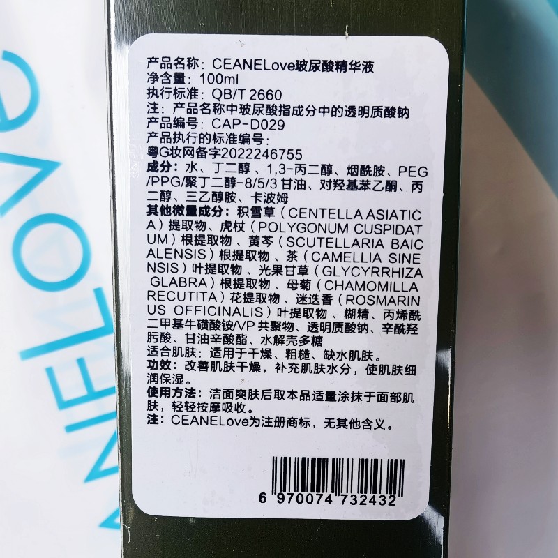 产品成分:去离子水、透明质酸钠、水解透明质酸、β-葡聚糖。