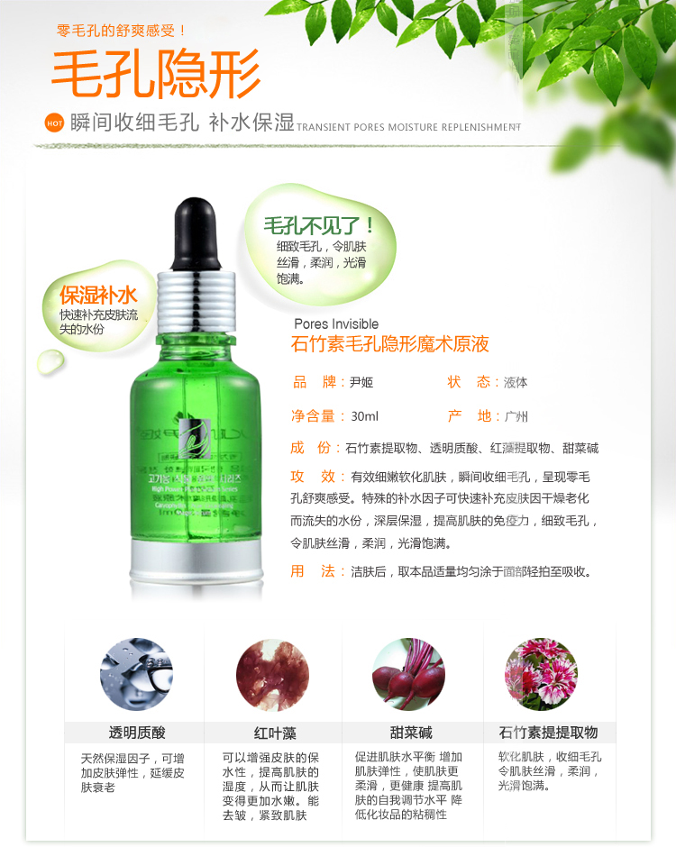 产品功效:有细嫩软化肌肤,瞬间收细毛孔,呈现零毛孔舒爽感受。特殊的补水因子可即时补充皮肤因干燥老化而流失的水份,深层保湿,提高肌肤的抵抗力,细致毛孔,令肌肤丝滑、柔润,光滑饱满。
