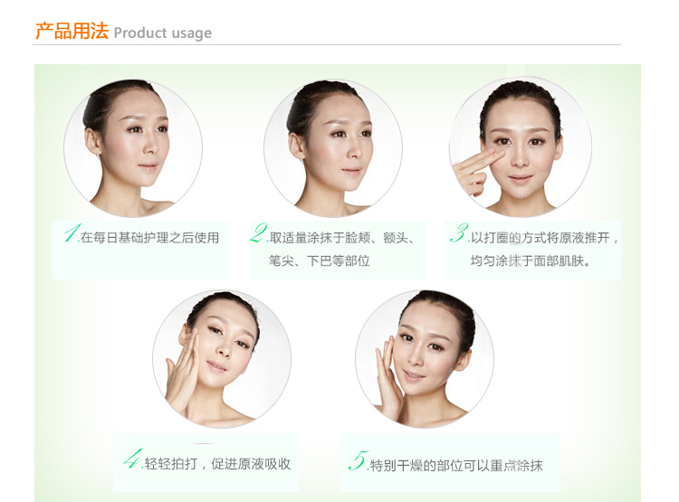 使用方法:洁肤爽肤后,取本品2-3滴,均匀涂于面部、颈部,轻柔按摩至吸收。搭配精华或营养霜使用果会更好。