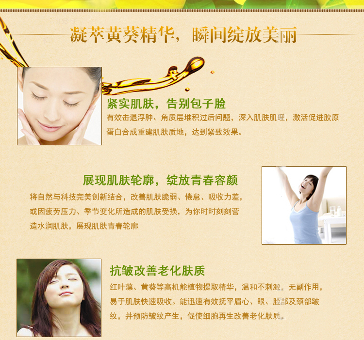 3.柔软肌肤,有抗氧化,帮助紧致提拉脸部轮廓,焕发肌肤健康光彩。