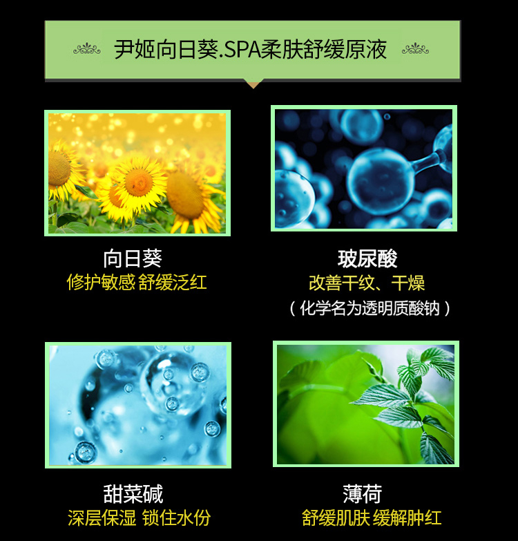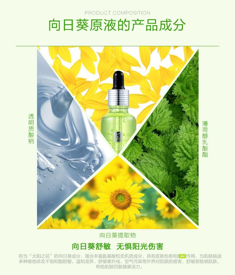 2.蕴含向日葵提取物,为肌肤输送多种维他命及不饱和脂肪酸,温和滋养,舒缓紫外线、空气污染等外界对肌肤的侵害,加强肌肤耐受性,舒缓易敏肌肤;