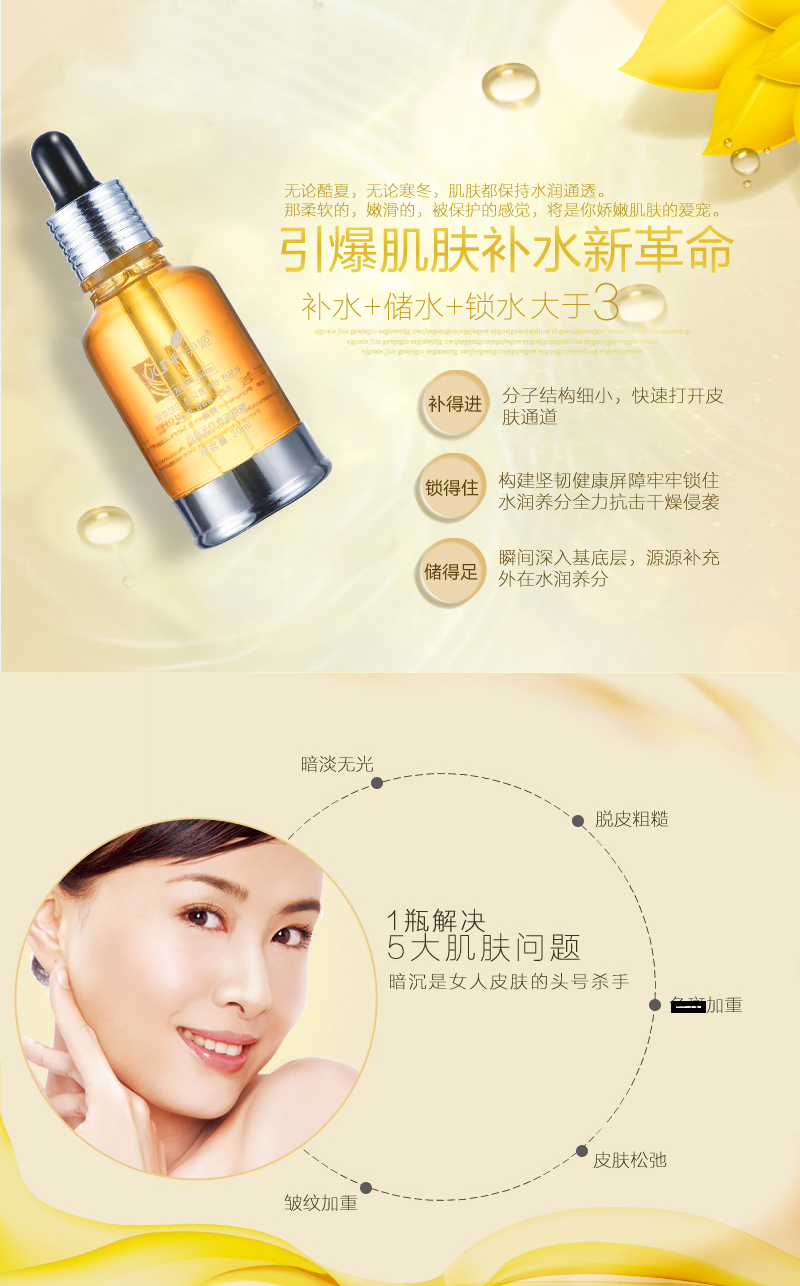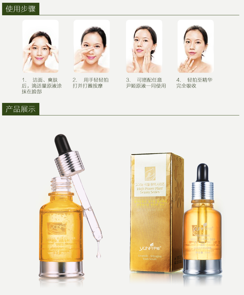 使用方法:洁肤爽肤后,取本品2-3滴,均匀涂于面部、颈部,轻柔按摩至吸收。搭配精华或营养霜使用果会更好。