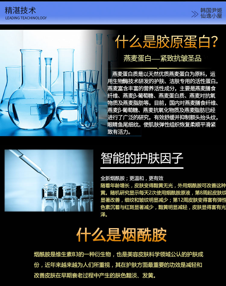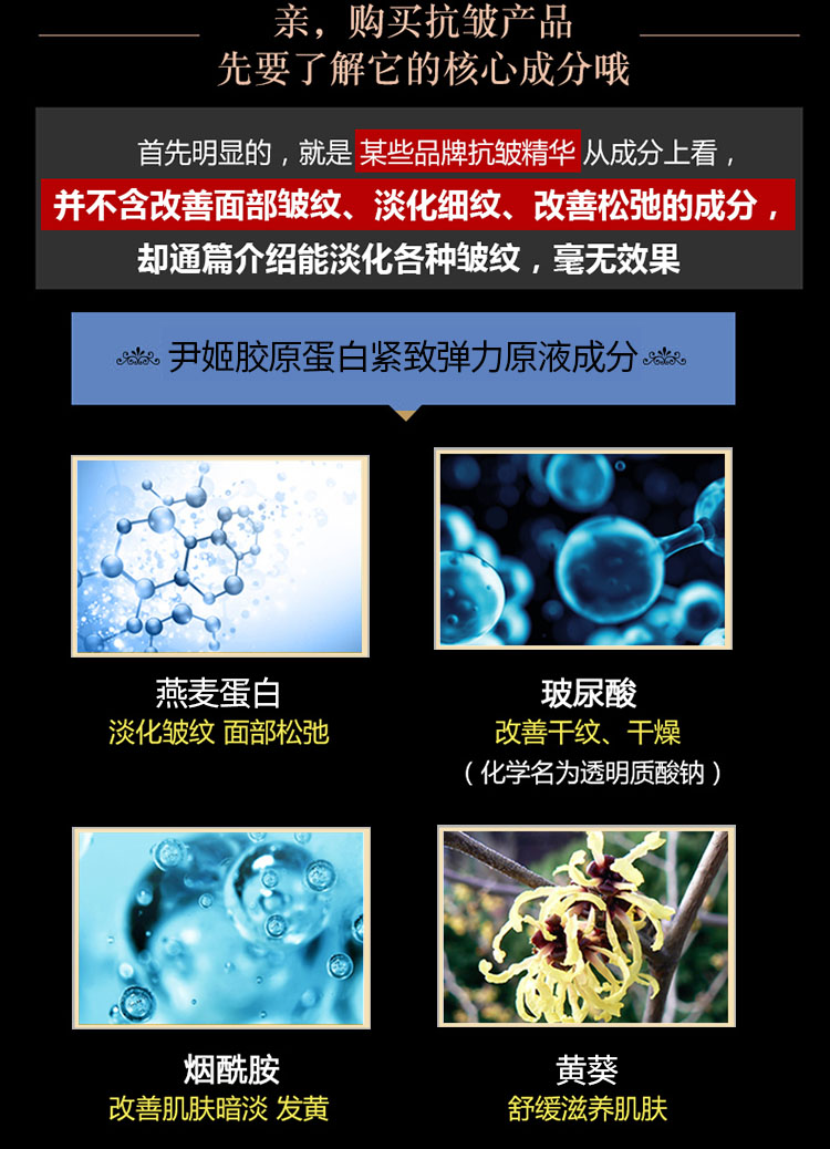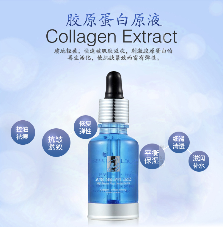 产品功效:从肌肤自身合成胶原蛋白的原理着手,在配方中含有能激发胶原蛋白生成的两大活性成份: 红叶藻提取物和燕麦蛋白提取物,能对胶原蛋白合成和生命力有着增强果,促进肌肤自身合成胶原蛋白。促进更新,质地轻盈,即时被肌肤吸收,剌激胶原蛋白的活化,使肌肤紧致而富有弹性。
