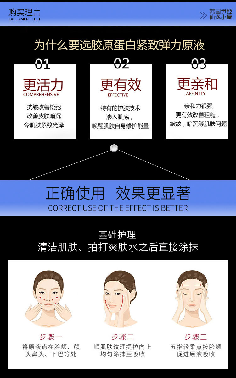 使用方法:洁肤爽肤后,取本品2-3滴,均匀涂于面部、颈部,轻柔按摩至吸收。搭配精华或营养霜使用果会更好。
