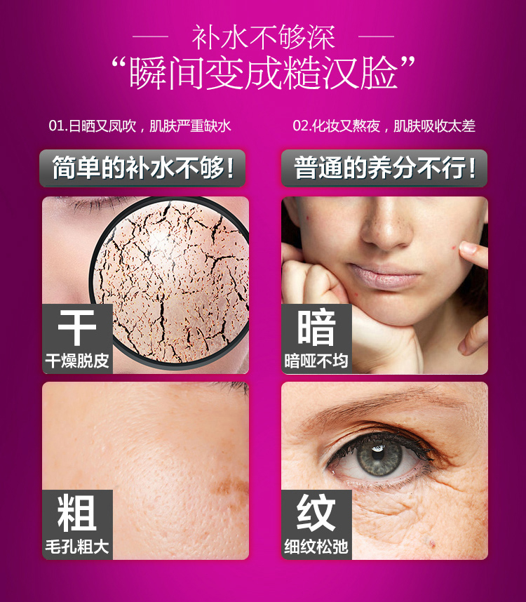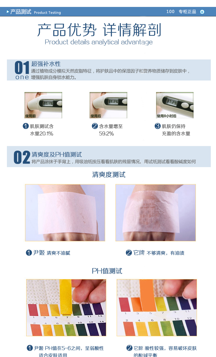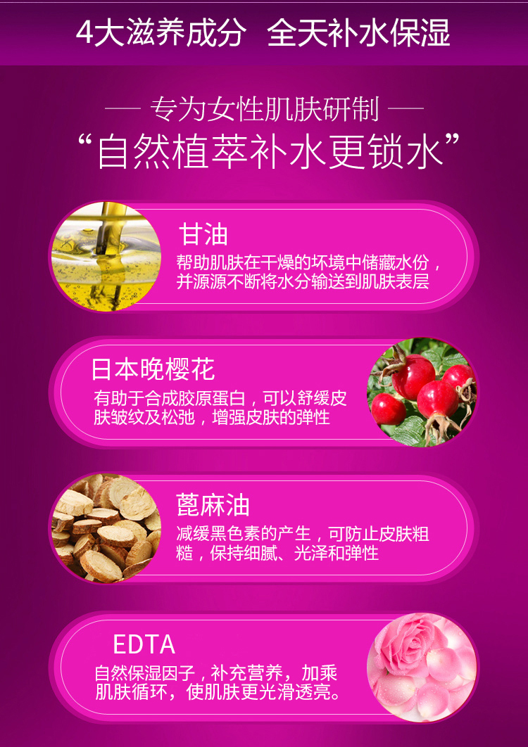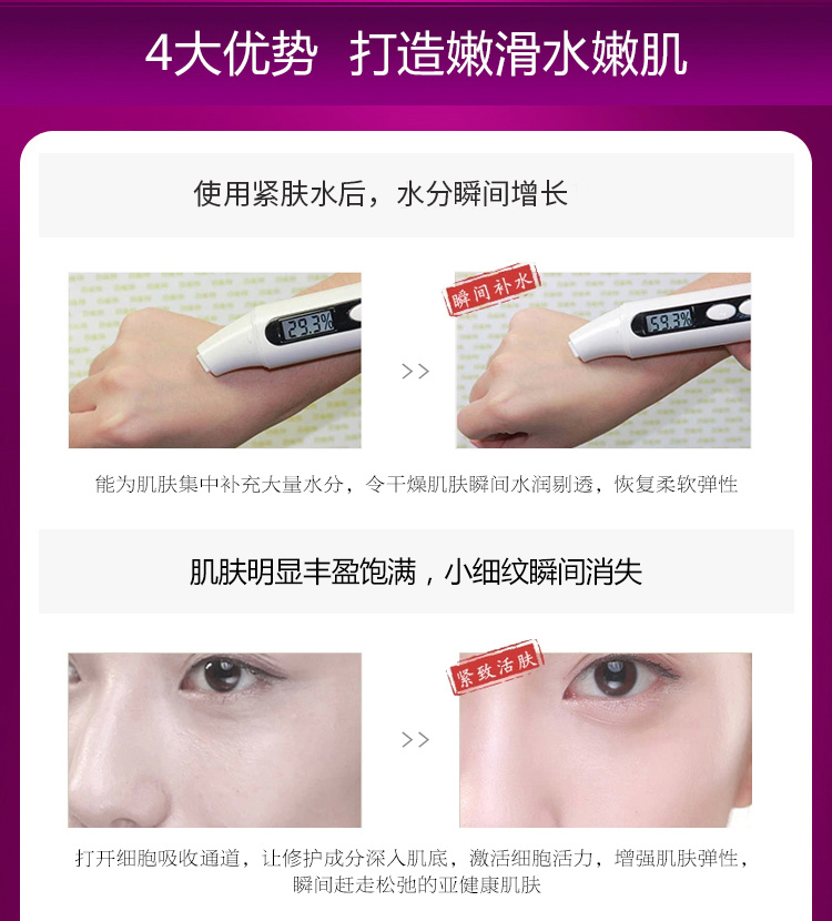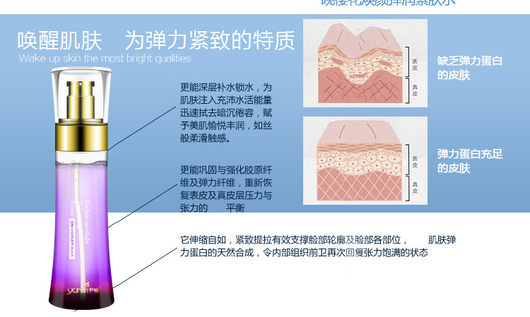 产品功效:调整肌肤PH,为干燥、缺乏弹力肌肤补充大量水分,调整疲惫无神的肌肤,补充养分和能量,促进肌肤自我更新频率,令肌肤呈现水嫩柔滑的良好状态,后续保养果加倍。