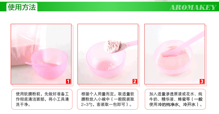 使用次序:每次25g,约四平匙,与蒸馏水(冷开水或者自来水)约70ml均匀调和,2分钟内上膜完毕,休息20-30分钟后取膜,不需要再以清水洗净。