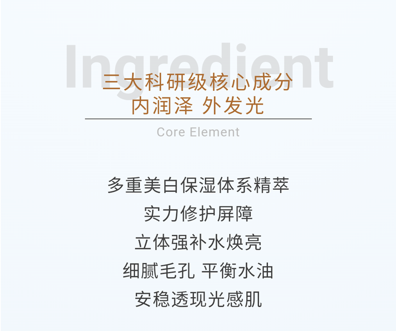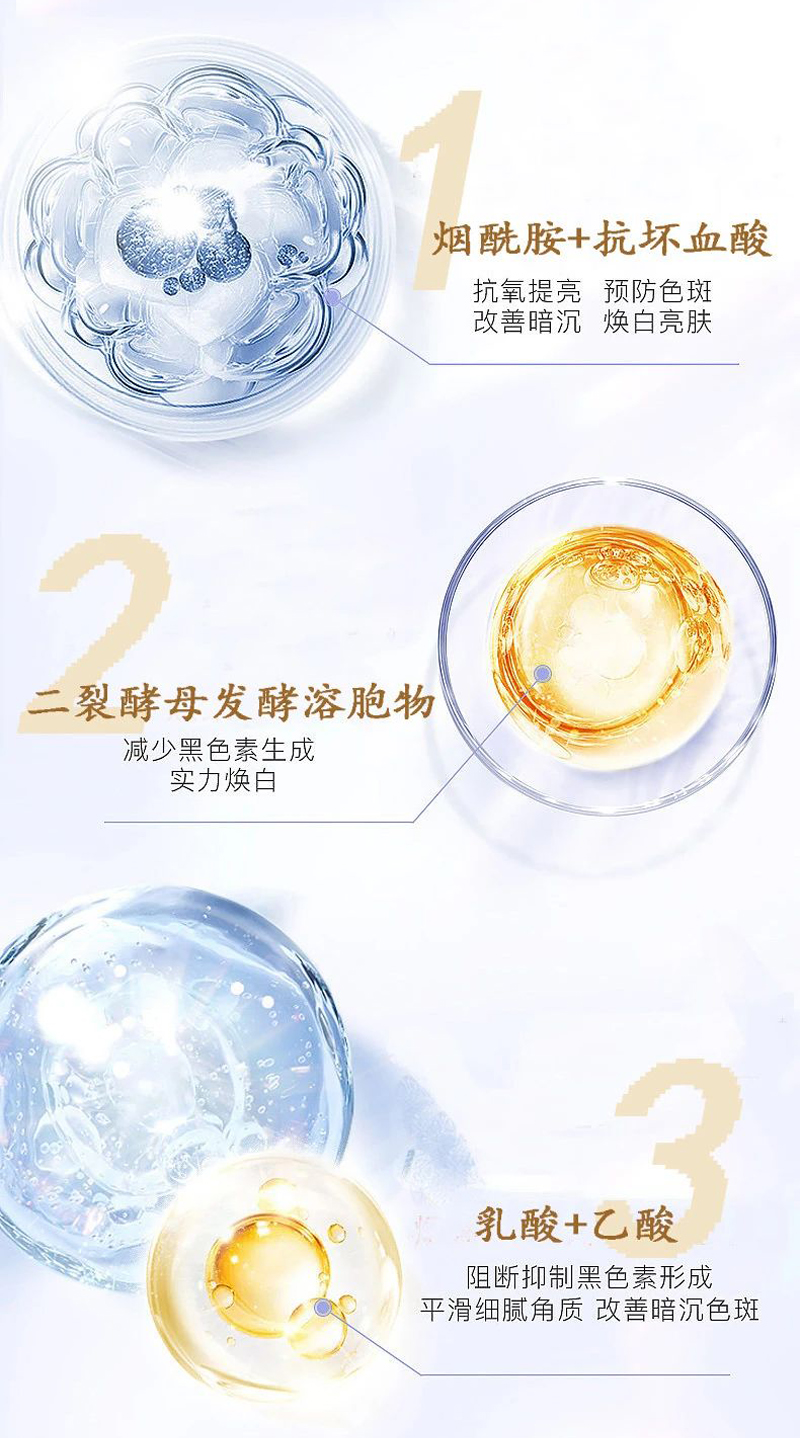 3.焕白亮颜:淡化黑色素,均匀肤色,深层焕白肌肤,整体提亮肌肤。