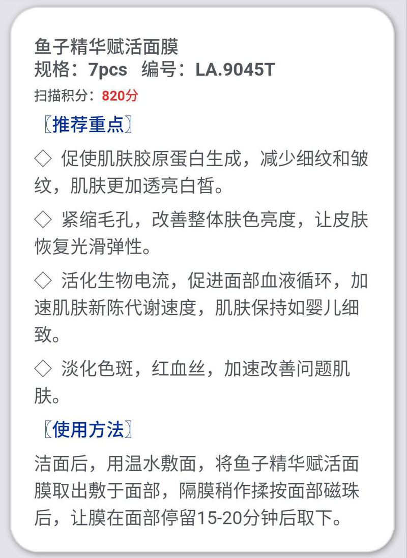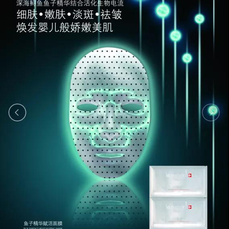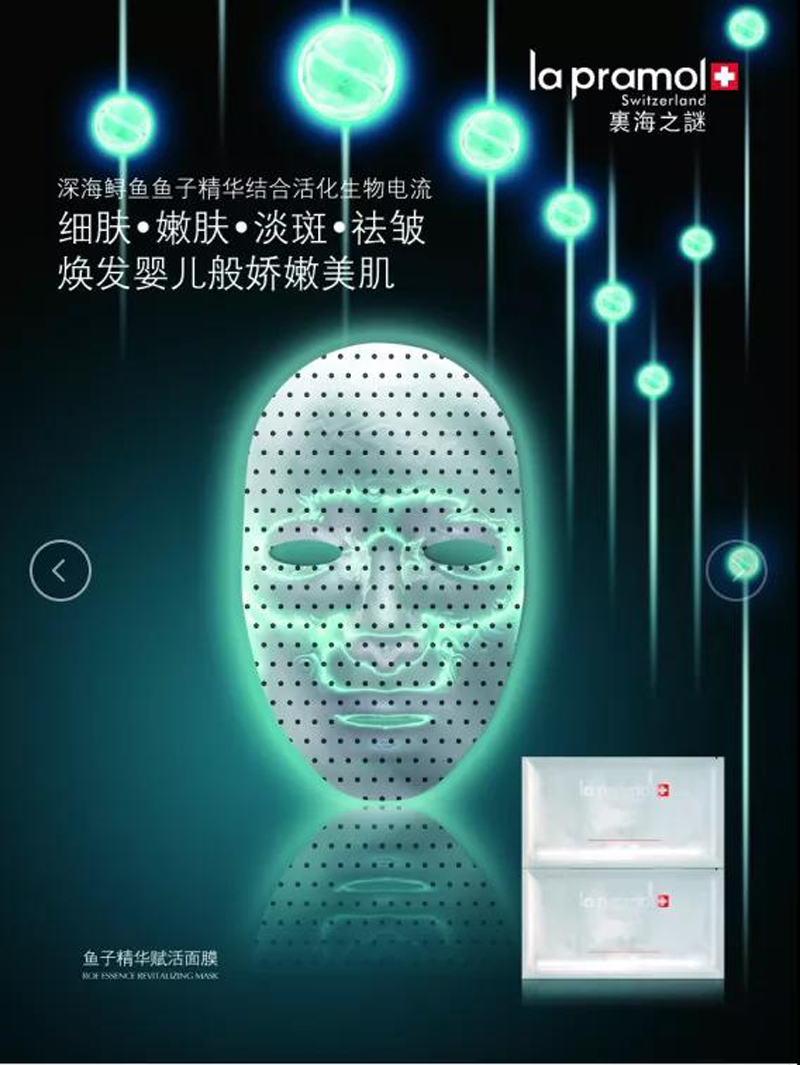 产品功效:瑞土La pramol研究院的研发人员与加拿大雅弗生物实验室、UBC大学、多伦多大学和滑铁卢大学尖生物学博士、电子物理学博士以及物理磁场学博士合作研发的鱼子精华赋活面膜,将鱼子精华、植物精萃等有护肤成分与纳米级智慧感应生物磁科技相结合,通过纳米红外理疗,改善肌肤微循环,同时修复多种肌肤问题。借磁珠稍作按摩半分钟即可达到传统面部拔筋30分钟的功!