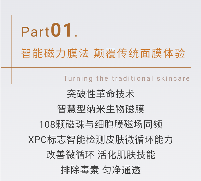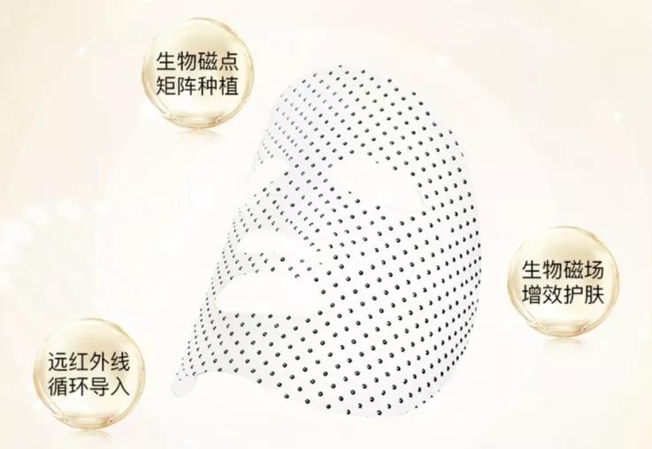 2.高科技太空磁膜紧密贴合肌肤,点阵式磁珠排列在肌肤表面形成微磁场,深层渗透改善吸收,开启无数肌肤吸收通道,加倍承载运输营养成分,令肌肤保养事半功倍。通过磁频作用力疏通经络、推动经气运行、促进血液循环,调节肌肤代谢紊乱等,使肌肤更加健康。