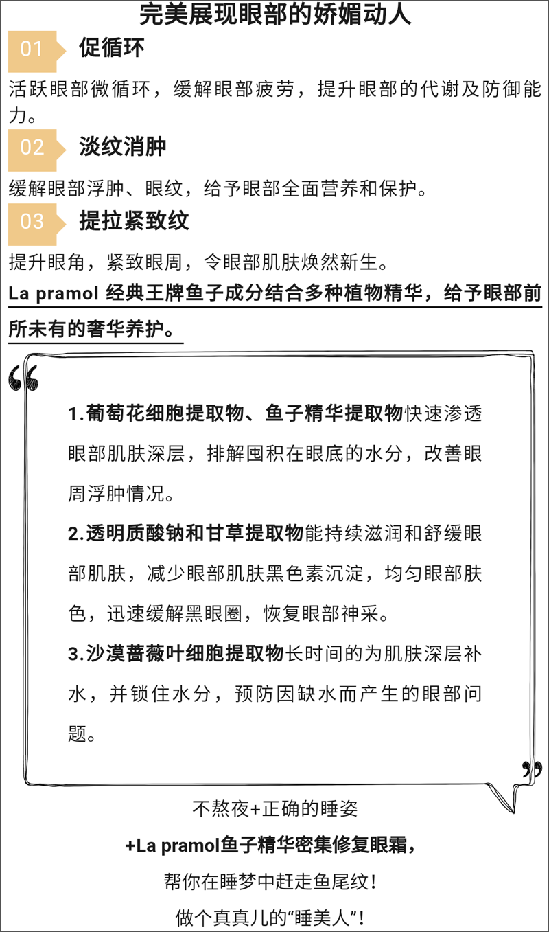 产品功效:含精美的鱼子精华浓缩颗粒的全能神奇眼霜,消肿、紧致、淡纹、提升、祛黑五并举,并利用天然植物香氛能量舒缓眼周疲劳!