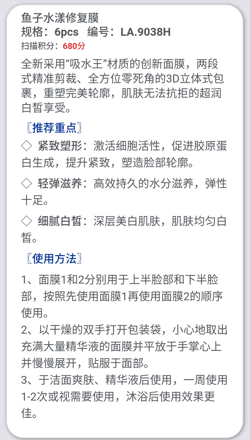 产品功效:全新采用“吸水王”材质的创新面膜,两段式精准剪裁、多方位零死角的3D立体式包裹,重塑完美轮廓,肌肤无法抗拒的超润白皙享受。