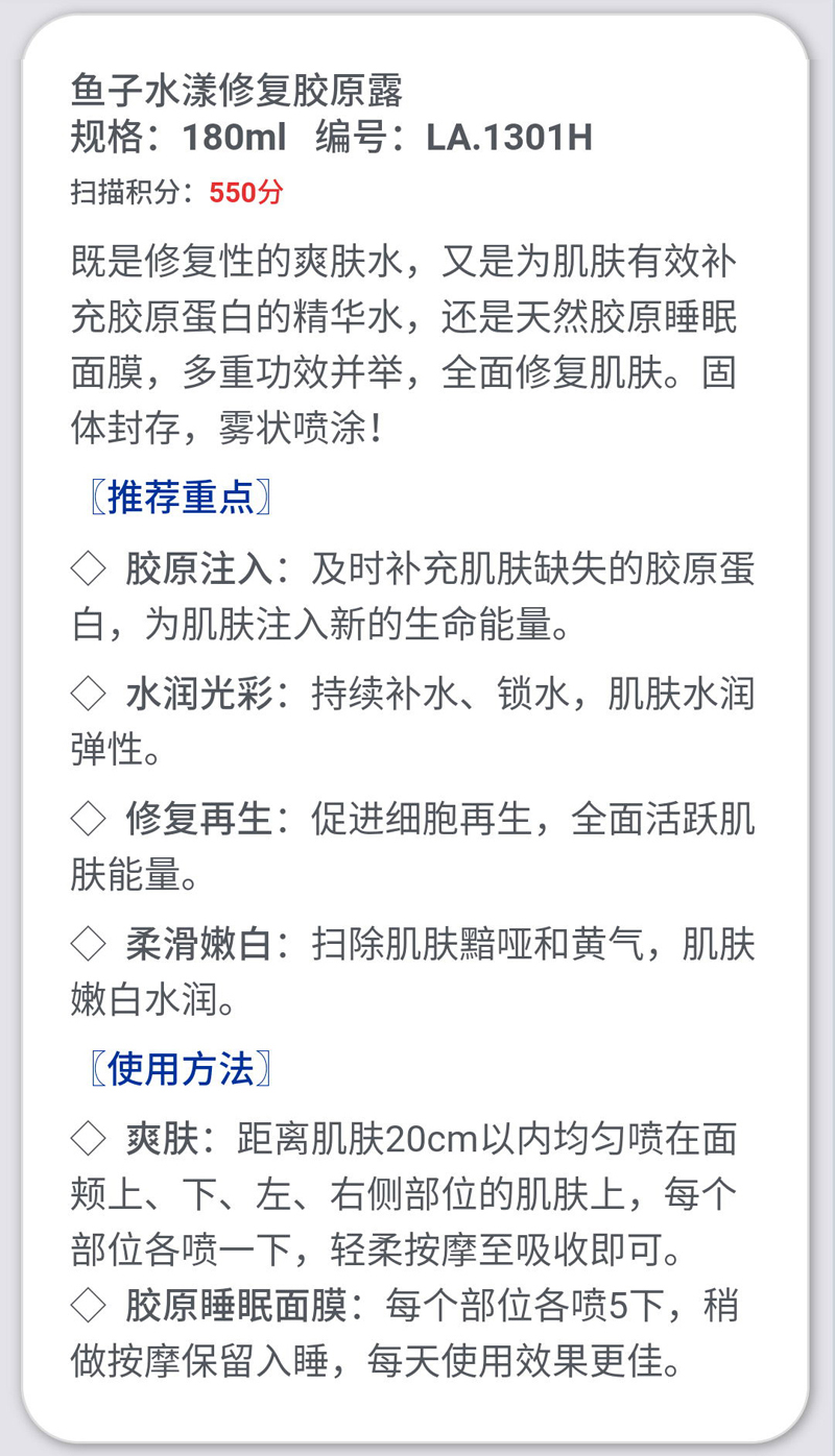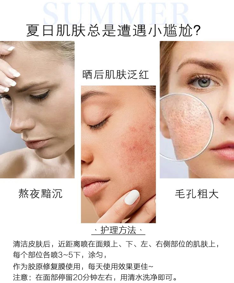 产品功效:既是修复性的爽肤水,又是为肌肤有补充胶原蛋白的精华水,还是天然胶原睡眠面膜,多重功并举,多方面修复肌肤。固体封存,雾状喷涂!