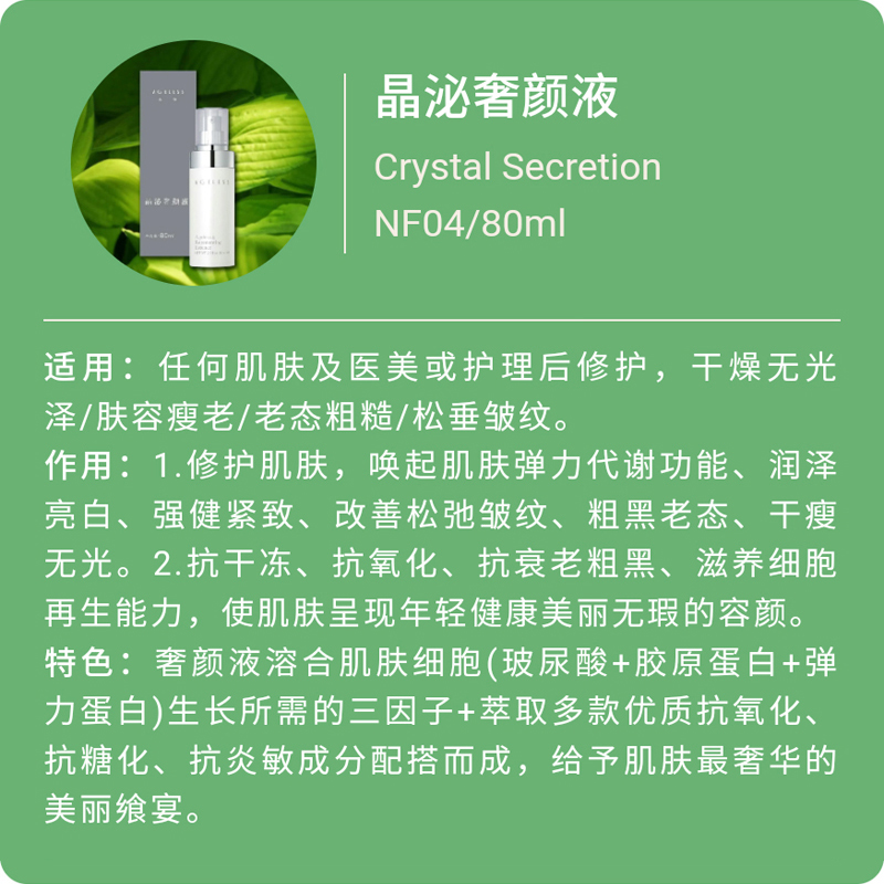 产品适用:任何肌肤及医美或护理后修护,干燥无光泽/肤容瘦老/老态粗糙/松垂皱纹。