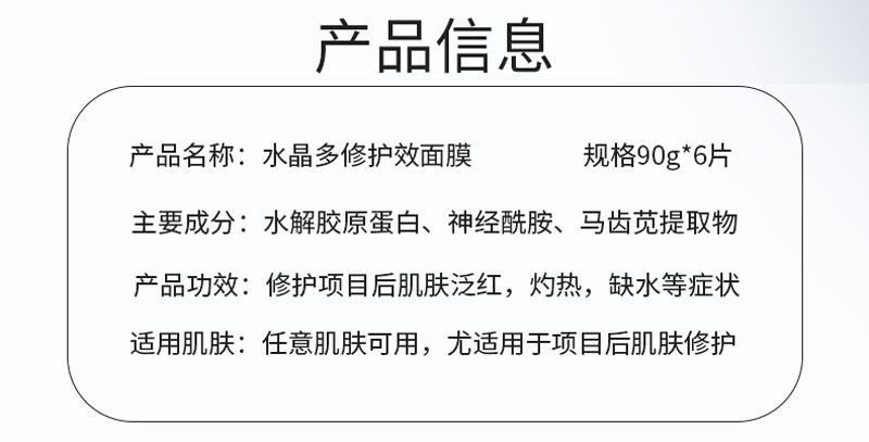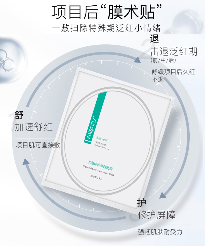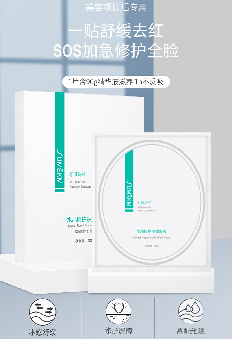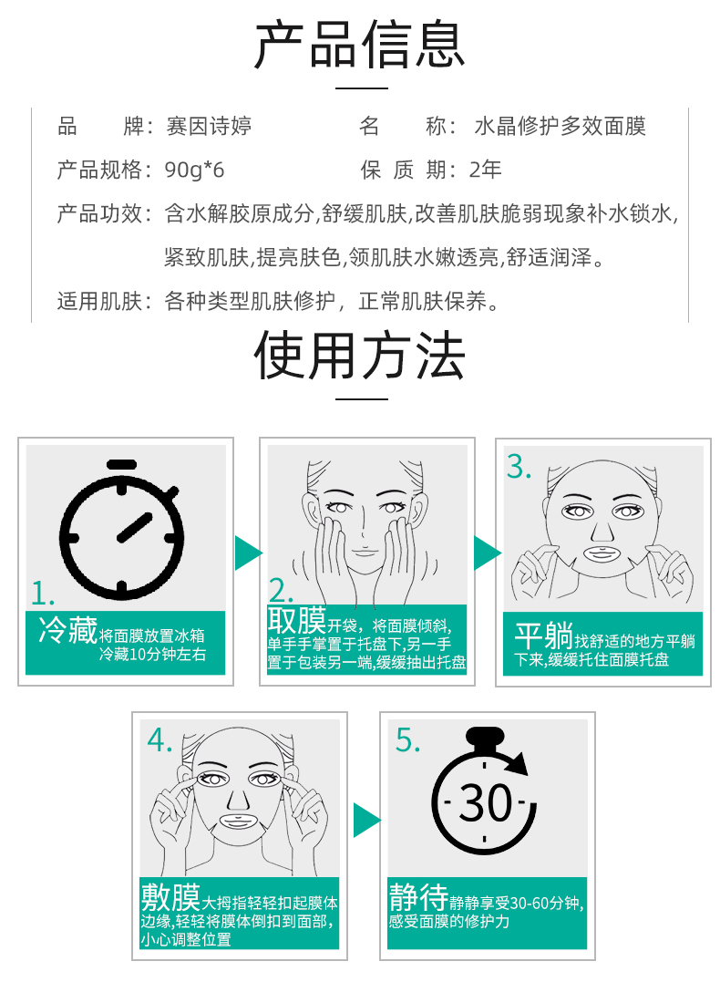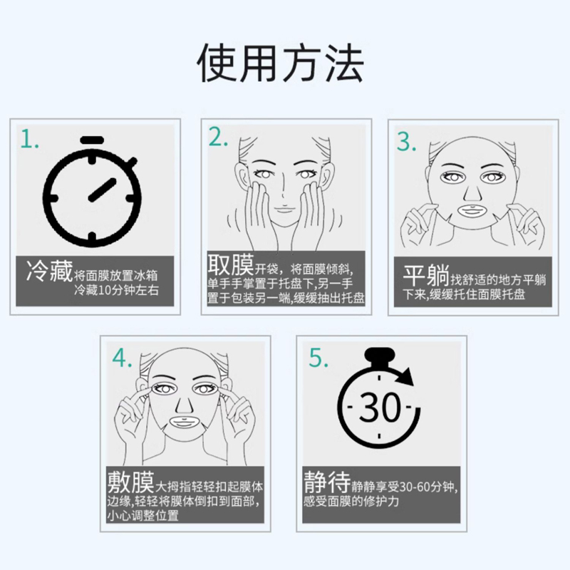 使用方法:洁肤后,撕开包装取出膜体,静敷于面部20-30分钟后揭去,配合按摩至吸收。冷藏后使用更佳。