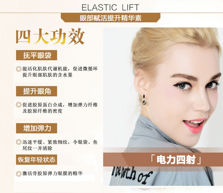 1、乳清蛋白成份迅速渗透至肌肤里层,帮助胶原蛋白纤维及弹力蛋白纤维紧密排列,即时提升眼部肌肤,令眼周肌肤持久紧实而富有弹性。
