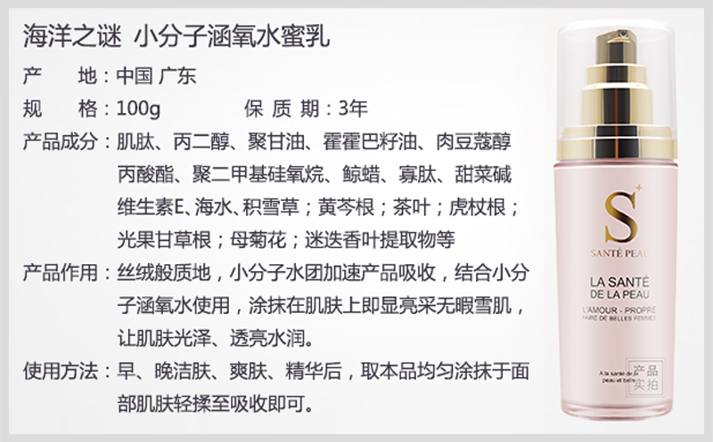 产品说明:丝绒般质地,小分子水团加速产品吸收,结合小分子涵氧水使用,让肌肤健康光泽,摸得着的水润。
