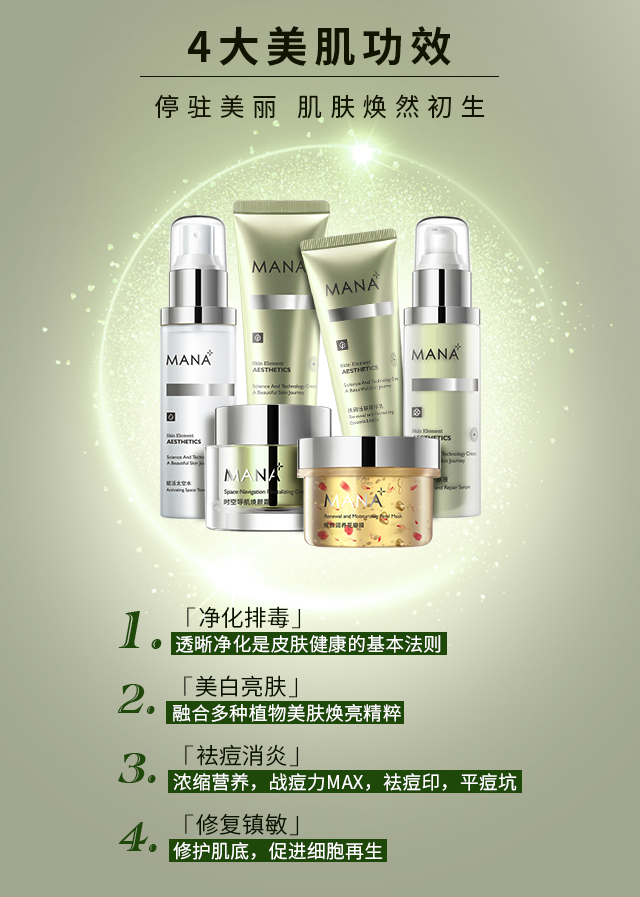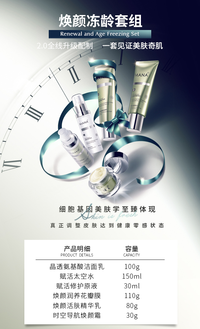 产品功:玛娜焕颜冻龄系列,全线升级配制,结合新型生物科学技术,融入多种天然植物萃取的美肤臻佳成分,从肌层进行滋养修护,有改善肌肤缺水、松弛、肤色暗沉等现象,卓调理肌肤至水嫩饱满状态,达到保湿、滋养、修护、紧肤等多重果。