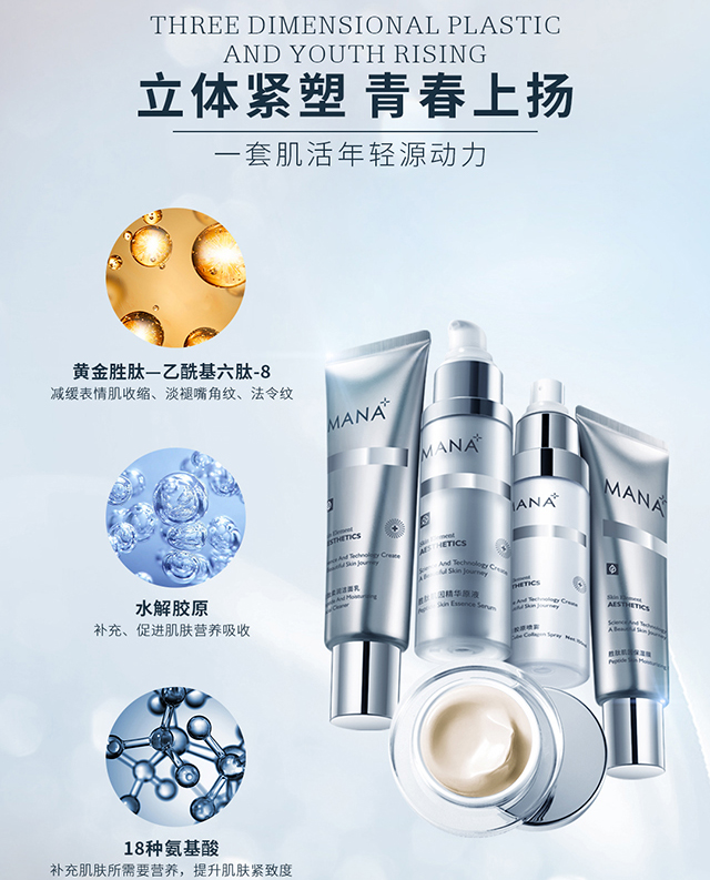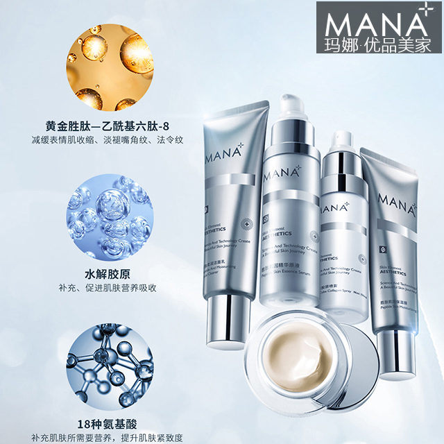 产品功:玛娜胜肽肌因精华系列,新一代升级配方,优选上乘天然植物萃取精华,添加多胜肽成分,深透补水、密集滋养、赋活修护,并大量补充肌肤胶原蛋白等营养,安抚肌肤,增加肌肤弹性,滴滴精粹如丝般浸润肌层,润泽肌理,提高肌肤紧实度,令肌肤焕回青春活力,细腻丰盈,展现水嫩饱满光彩。