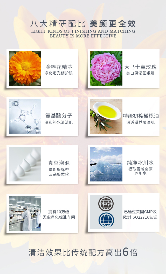 产品功:集卸妆、清洁为一体,泡沫绵密细腻,卓溶解面部彩妆及毛孔油污,特别融入金盏花精萃和氨基酸经典洁肤成分,温和洁净同时为肌肤注入充沛水分养分,深透保湿,舒润肌层,令肌肤清透柔滑不紧绷,绽放健康光洁之美。