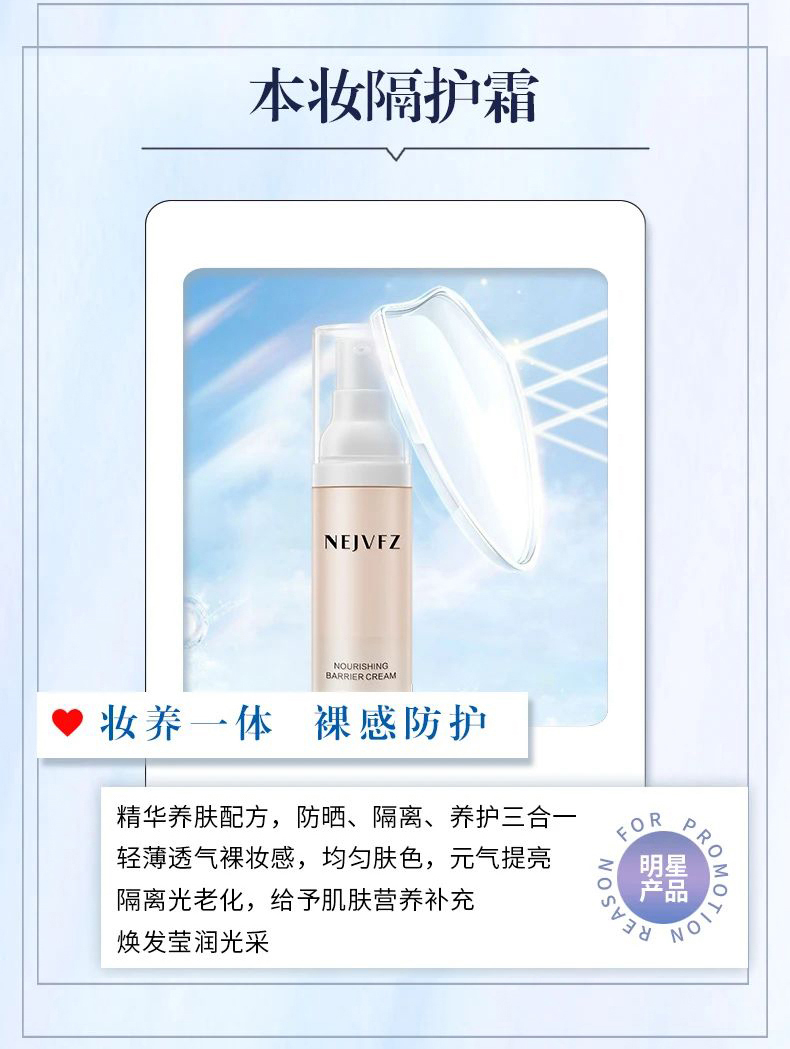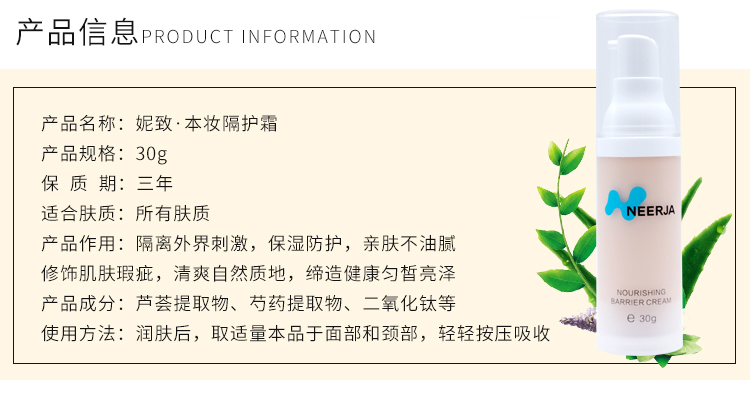 妮致 本妆隔护霜30g(SPF15+)隔离紫外线/空气污染、不卡粉/不浮粉、亮白/保湿/遮瑕/控油/修饰毛孔及细纹等问题