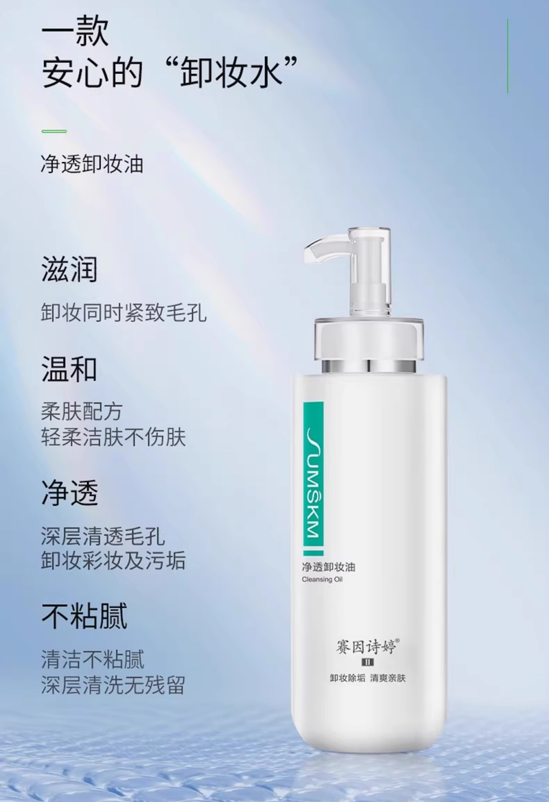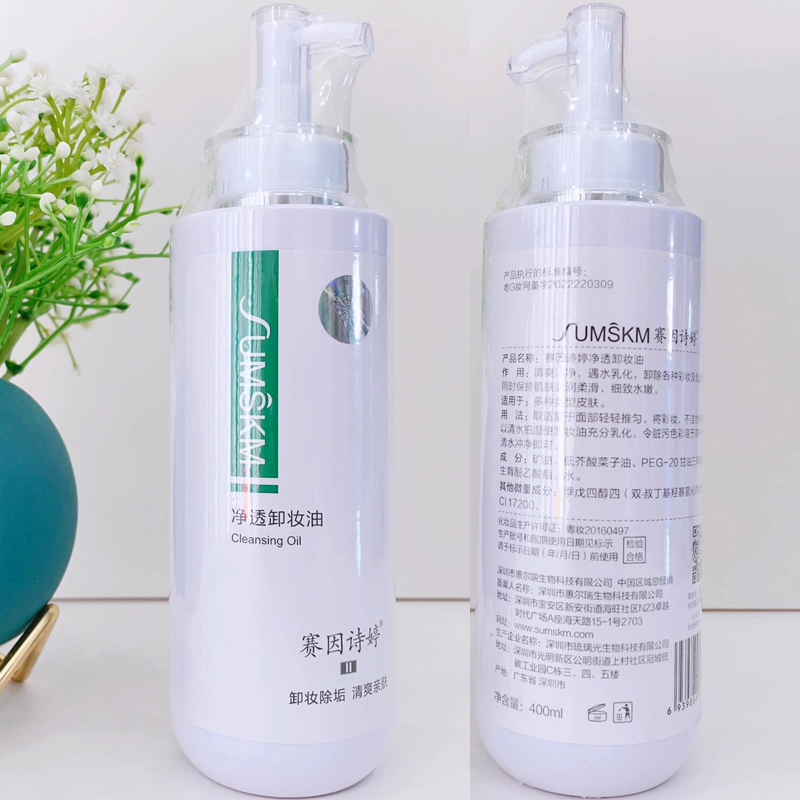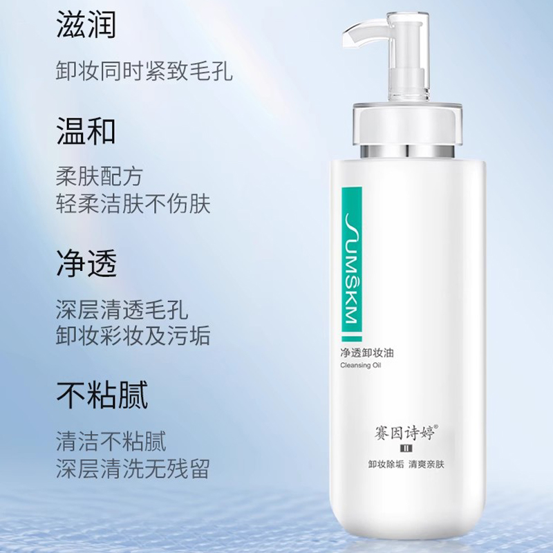 赛因诗婷 净透卸妆油400ml 商品关键词:卸妆除油 水嫩净透 适用范围:各种肤质 产品功效:亲水、温和、见水乳化,彻底卸除各种持久型彩妆及脸部毛孔污垢,同时保持肌肤滋润柔滑、细致水嫩。 使用方法:层卸妆油能深层卸除彩妆污垢,遇水乳化,代谢面部多余老化角质,干手干脸取适量于面部打圈按摩,避开眼周肌肤,用清水过掉后再用洁面乳洗净。