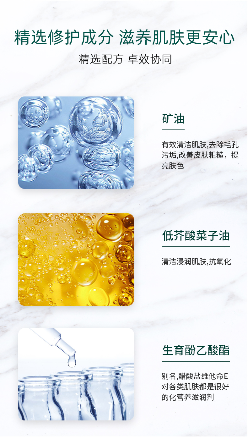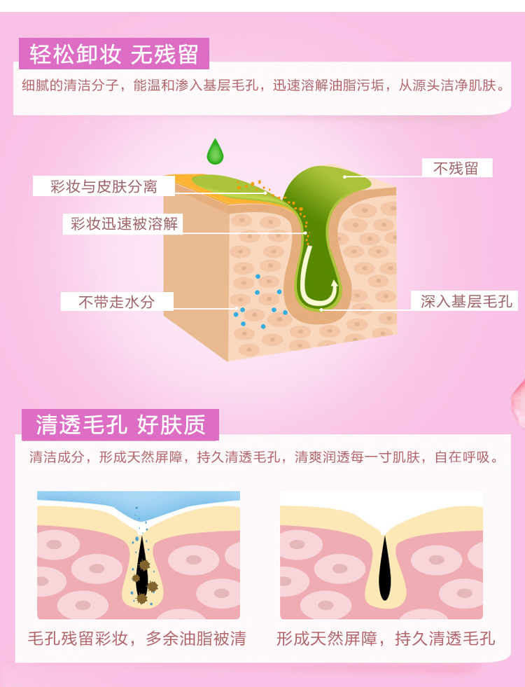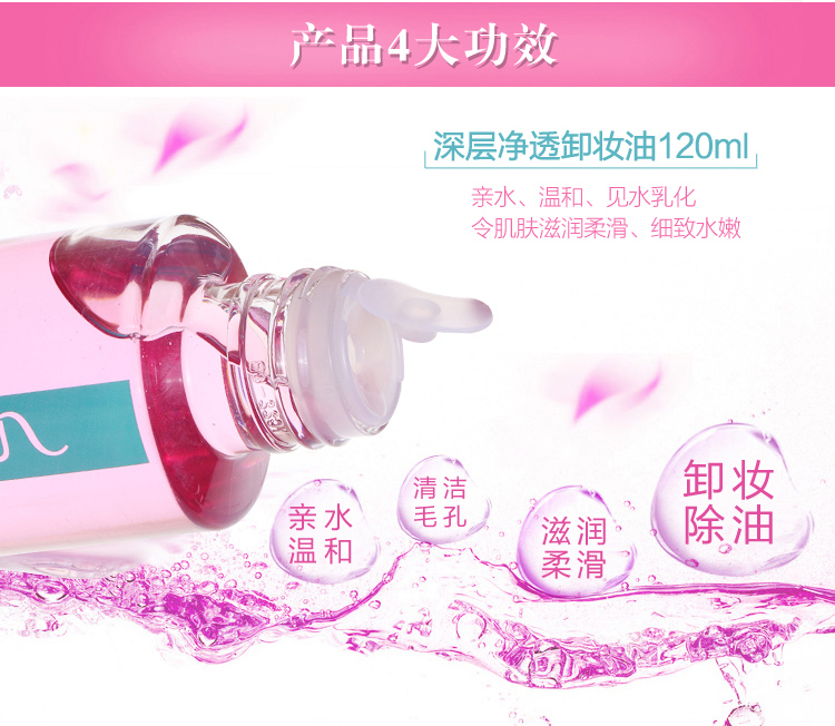 产品功效:亲水、温和、见水乳化,彻底卸除各种持久型彩妆及脸部毛孔污垢,同时保持肌肤滋润柔滑、细致水嫩。
