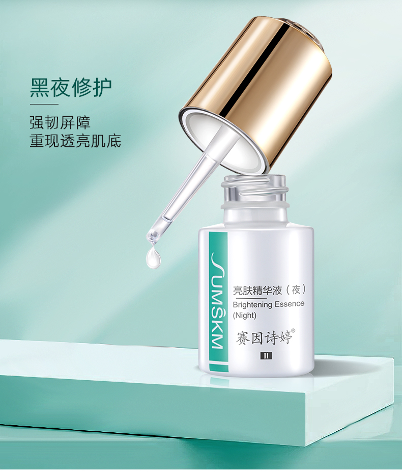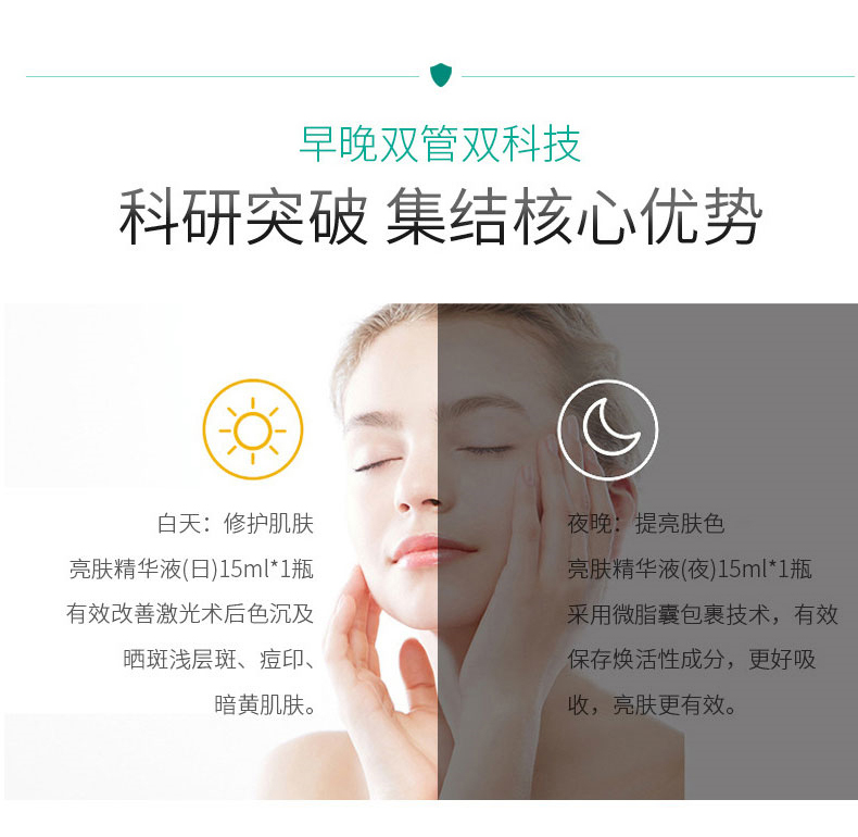 使用方法:洁肤后,取3-4滴敷于全脸,轻拍至吸收即可;白天使用亮肤精华液(日),晚上使用亮肤精华液(夜)。