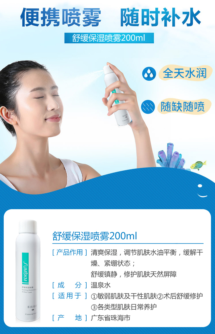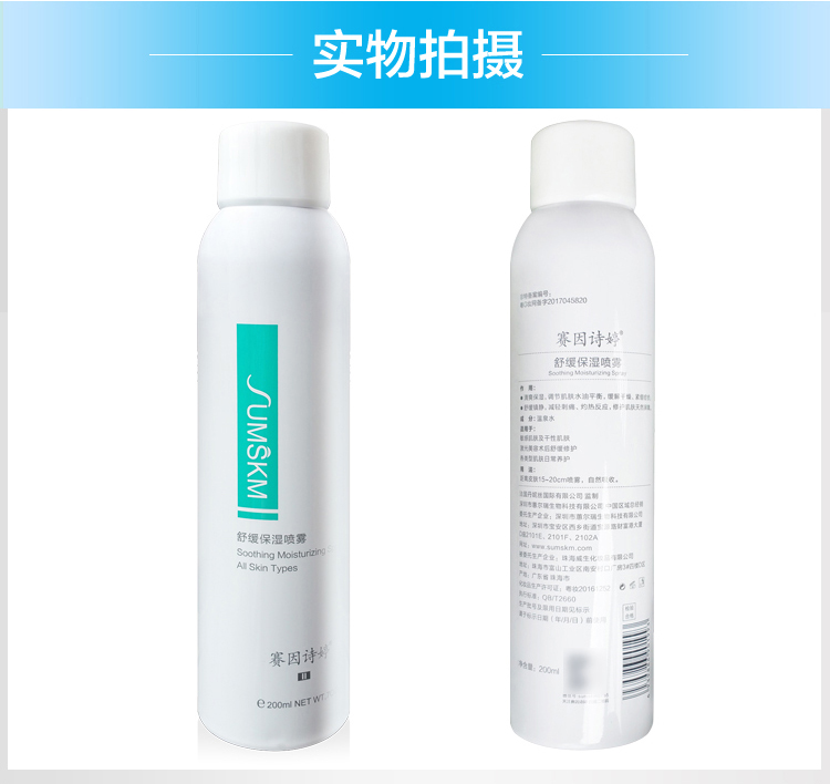 使用方法:距离皮肤15--20cm喷于面部肌肤,自然吸收